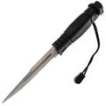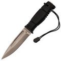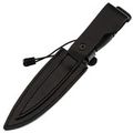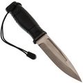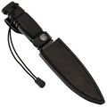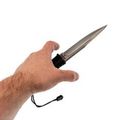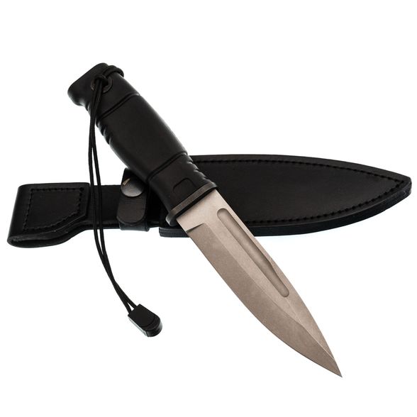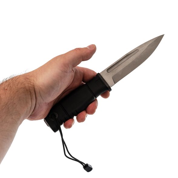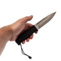 Рукоять изготовлена из термоэластопласта - материала, сочетающего прочность, устойчивость к температурным перепадам и уверенное сцепление даже в мокрой ладони. Эргономичная форма рукояти обеспечивает комфортное удержание в течение длительного времени, а сквозной монтаж повышает общую прочность ножа. Выступающая часть хвостовика образует ударную поверхность, полезную в полевых условиях.
