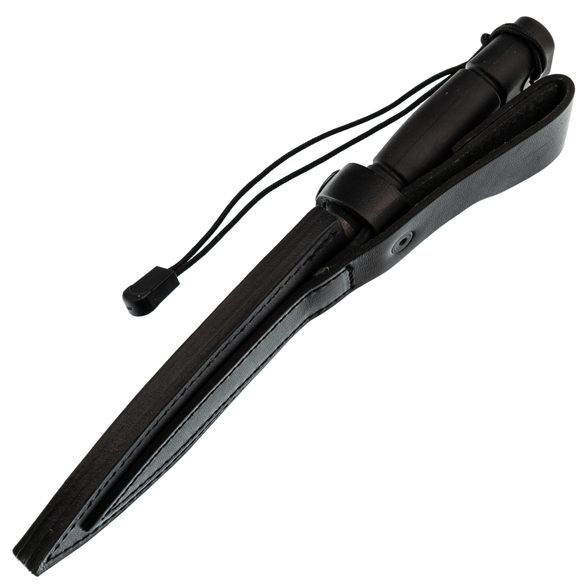 Ножны выполнены из натуральной кожи - это не только эстетика, но и долговечность. Кожа устойчива к износу, не растрескивается при активном использовании и сохраняет форму даже в условиях повышенной влажности. Жёсткий подвес обеспечивает стабильное положение ножа при движении, а надёжный хлястик фиксирует его в ножнах, исключая случайное выпадение.