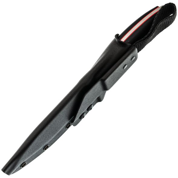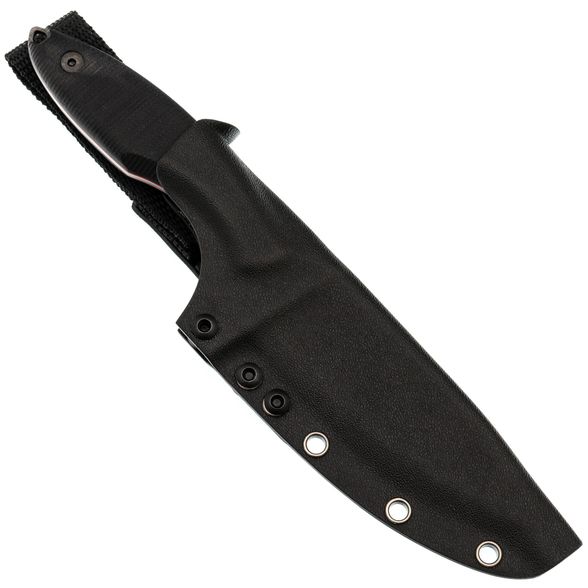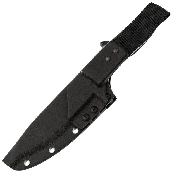 Ножны для "Канадца" выполнены из кайдекса — термопластика, точно формуемого под клинок. Кайдекс надежно удерживает нож, даже если носить его рукоятью вниз, и не теряет своих свойств при длительном воздействии влаги. Подвес выполнен с использованием жесткой стропы, обеспечивая надежное крепление. Дополнительные люверсы позволяют использовать альтернативные способы крепления, такие как Tek Lok или Ulti Clip, что делает нож удобным для переноски в различных условиях.