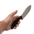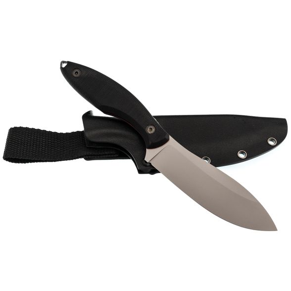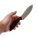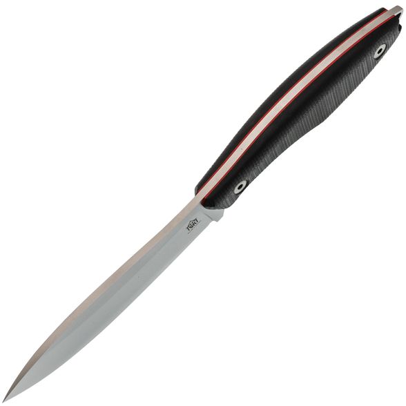 Рукоять ножа изготовлена из стеклотекстолита G10 — надежного и долговечного материала, устойчивого к воздействию влаги, ультрафиолета и экстремальных температур. Конструкция Full-Tang, с накладками из G10, обеспечивает исключительную прочность. Поперечная текстура накладок создает комфортное и надежное сцепление с рукой. Изогнутая форма рукояти с глубокой подпальцевой выемкой способствует удобному хвату, а смещение рукояти выше линии клинка позволяет комфортно резать на ровной поверхности.