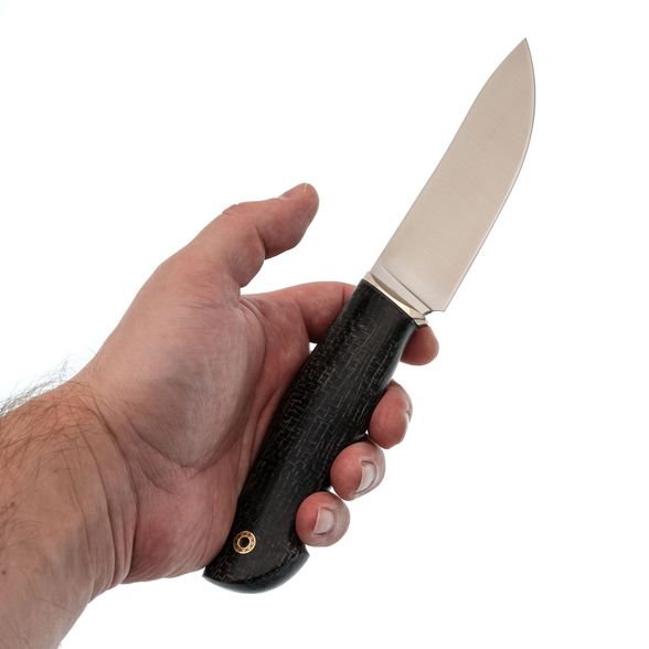 Рукоять «Каймана» выполнена из джутовой микарты, материала, который славится своей прочностью, лёгкостью и устойчивостью к воздействиям окружающей среды. Она прекрасно адаптируется к разным условиям, становясь более цепкой при намокании, что улучшает сцепление в любых ситуациях. Со временем рукоять приобретает уникальный затёртый внешний вид, который придаёт ножу особый характер. В сочетании с выверенной изогнутой формой рукоять идеально ложится в руку, что позволяет работать ножом комфортно и долго.