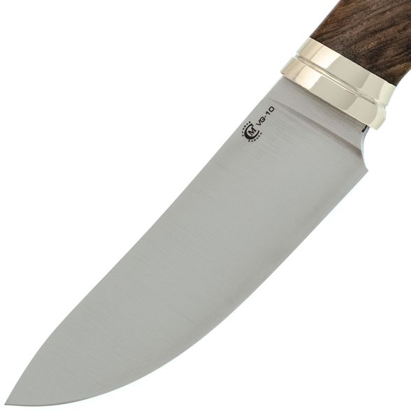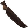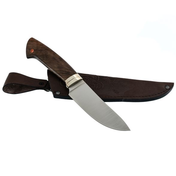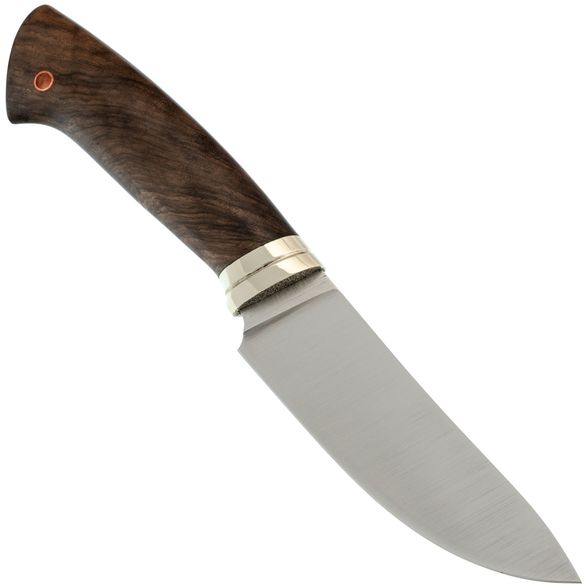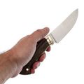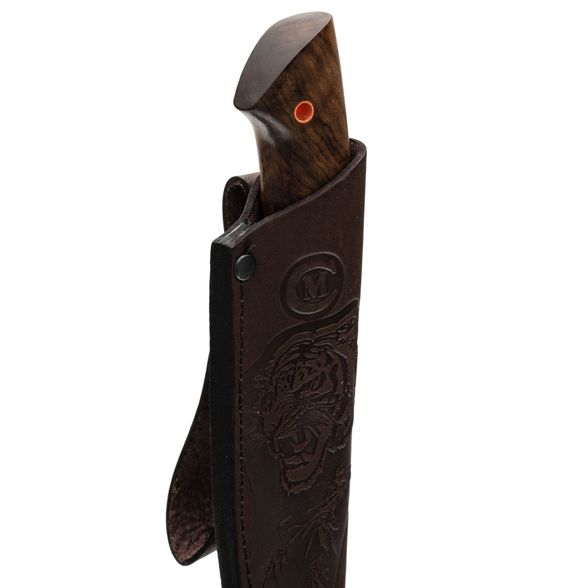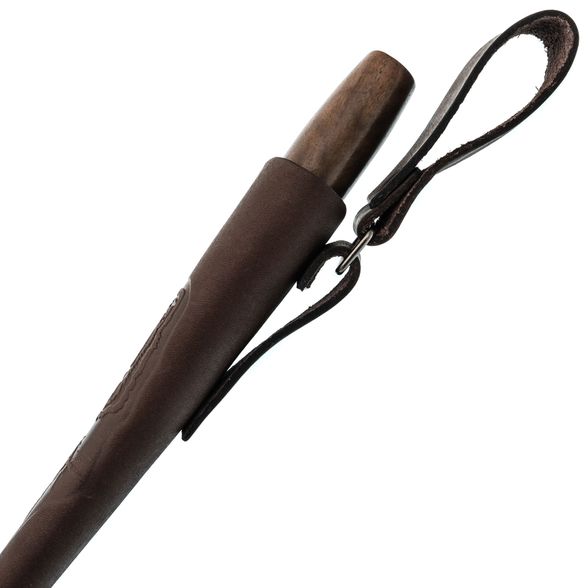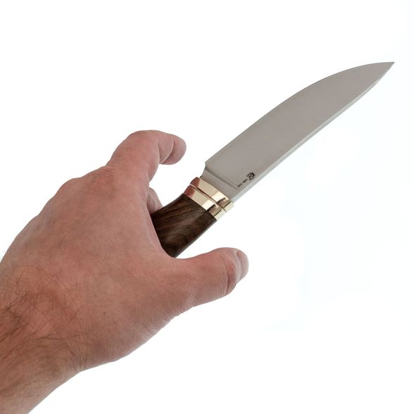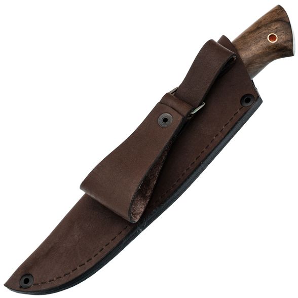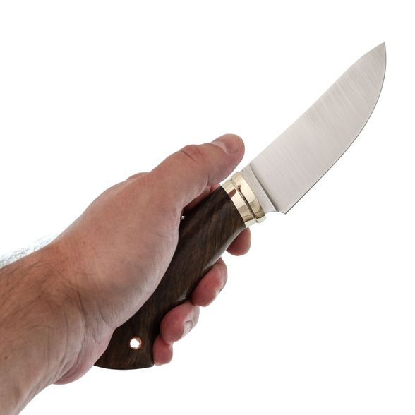 Рукоять ножа выполнена из ореха, что придает ей уникальный внешний вид и приятную на ощупь текстуру. Деревянная рукоять не только обеспечивает надежный и комфортный хват, но и имеет преимущество перед синтетическими материалами в холодную погоду, не вызывая дискомфорта. Изогнутая форма рукояти идеально подходит для длительной работы, позволяя рукам не уставать и обеспечивая точное позиционирование ножа.