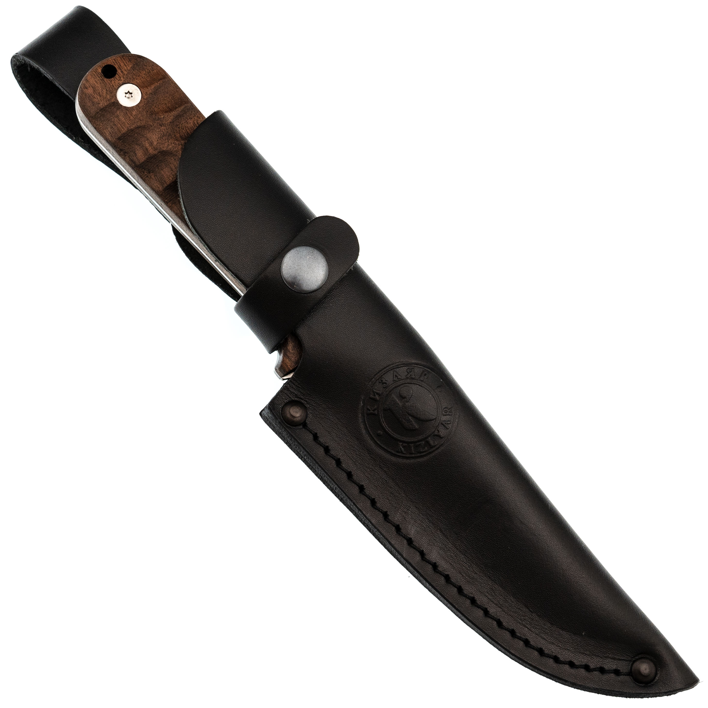 Погружные ножны из натуральной кожи фиксируют Кефарт глубоко и надёжно, защищая клинок и не мешая в движении. Свободный подвес позволяет ножу слегка играть на ремне, не цепляясь за одежду и снаряжение при ходьбе, приседаниях и работе в лагере. Достаётся нож уверенно, возвращается на место без "пристрелки" - всё интуитивно и удобно в повседневном использовании.