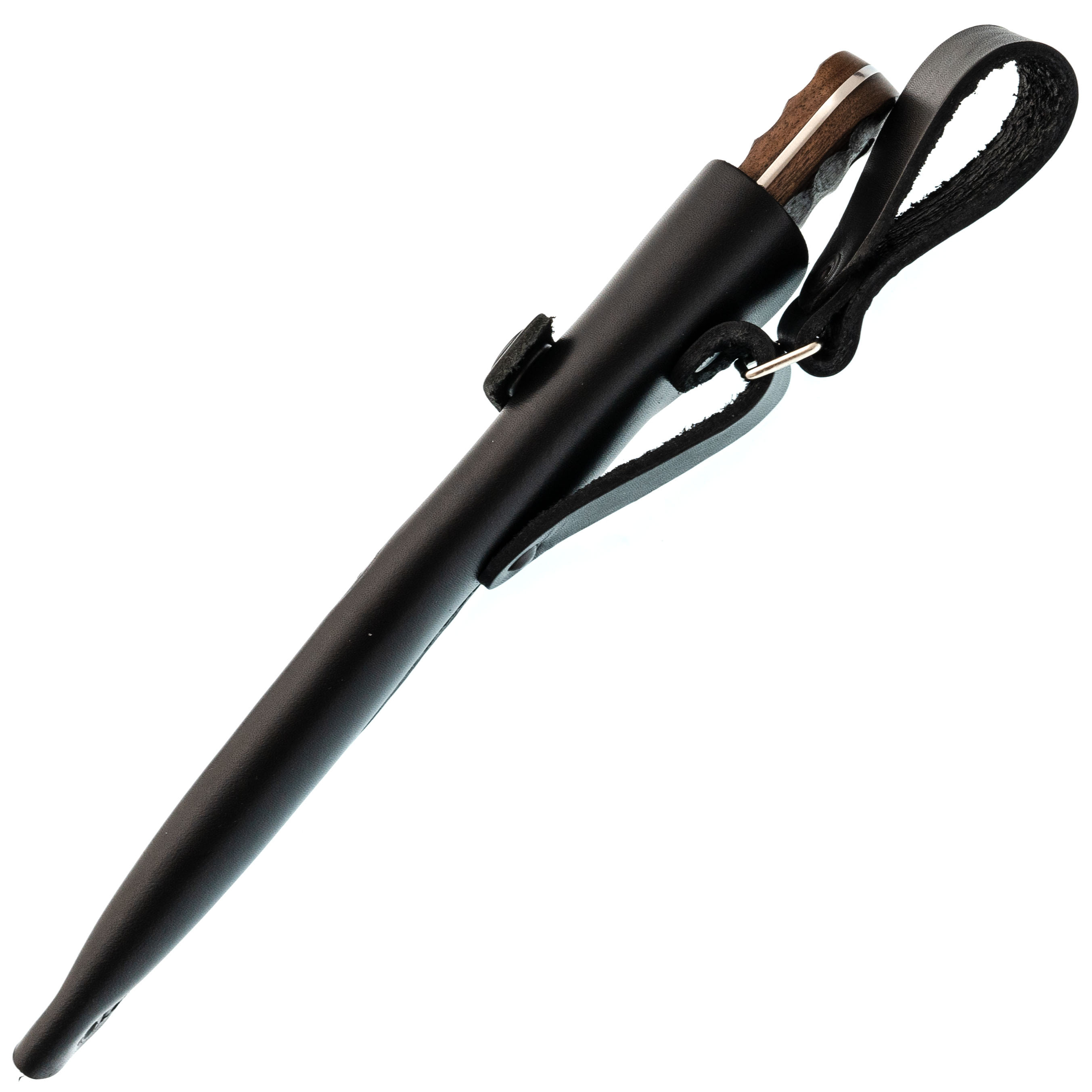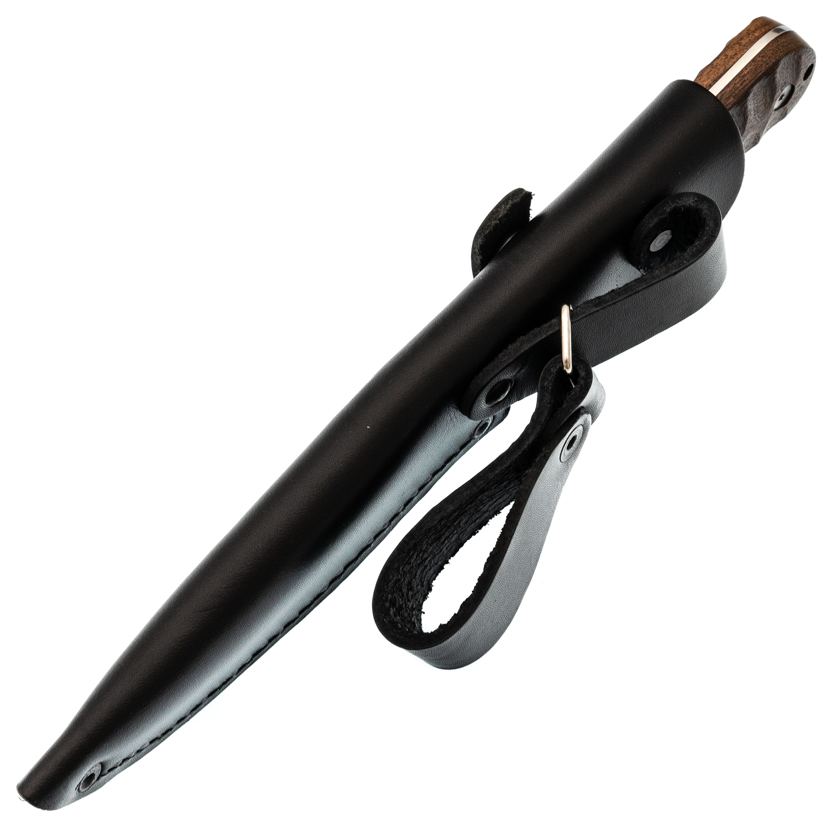 - Натуральная кожа ножен - плотная и износостойкая, хорошо держит форму и надёжно фиксирует нож. Кожа со временем покрывается лёгкой патиной, подстраиваясь под манеру ношения владельца и добавляя ножу характер.