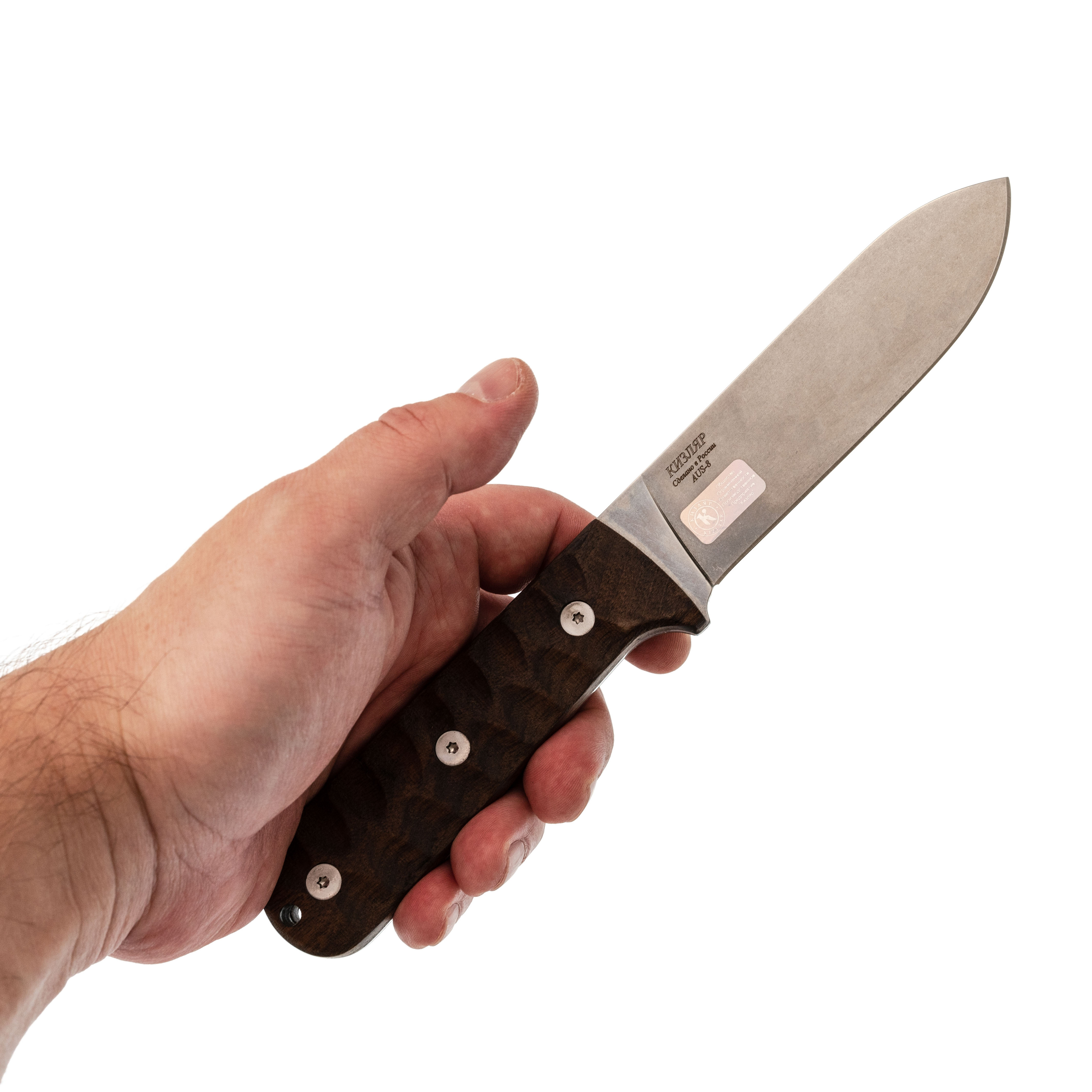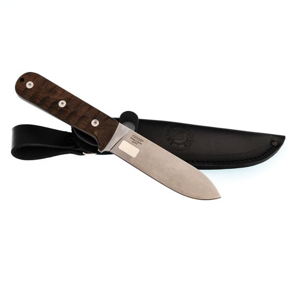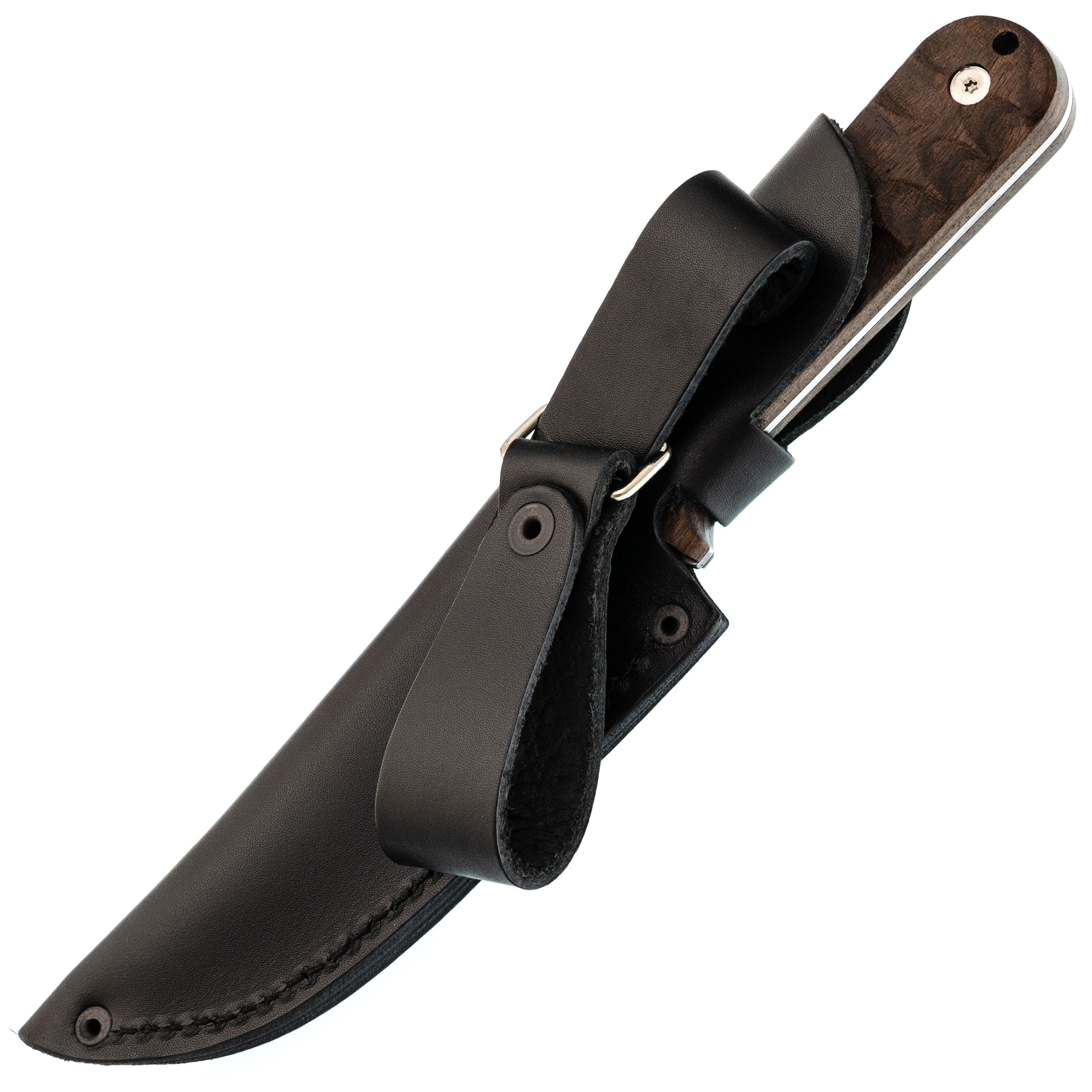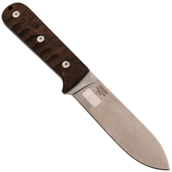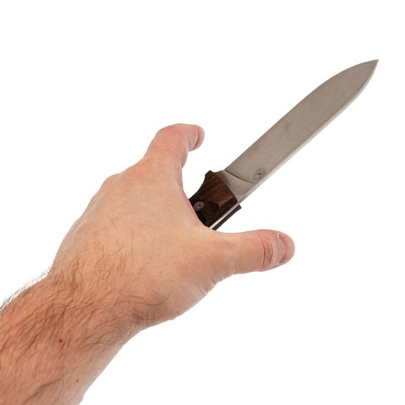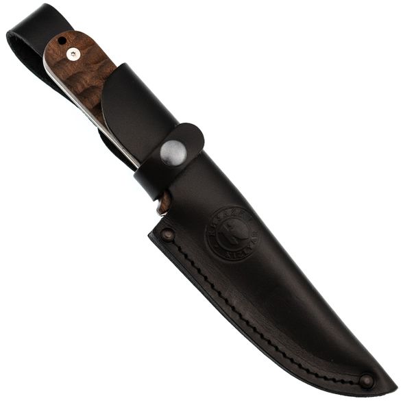 Объёмная рукоять из ореха рассчитана на длительную работу без усталости. Форма заполняет ладонь, не навязывая жёстких ограничений по хватам, а цепкая фрезеровка добавляет уверенности, когда руки влажные или в перчатках. Нож комфортно ощущается и в крупной ладони, и в средней, не натирает и даёт хороший контроль над клинком.