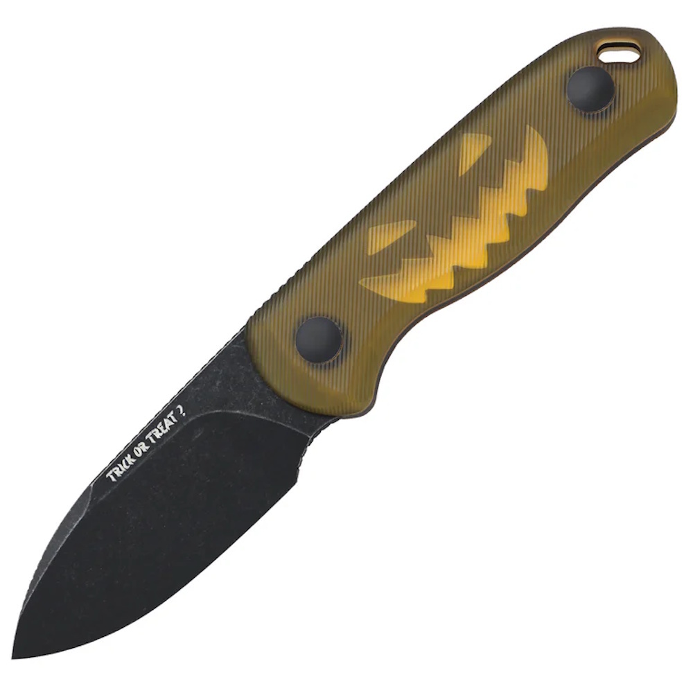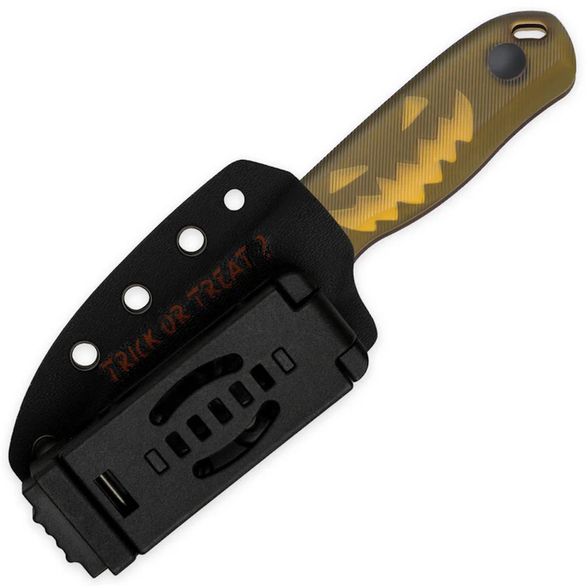 Клинок Drop Point демонстрирует отличную универсальность для различных задач. Черное покрытие не только придает стильный вид, но и эффективно скрывает следы использования. С двух сторон нанесены тематические изображения: с одной - белая рожица, с другой - праздничная фраза "Trick or treat?", добавляющая игривости в строгий облик инструмента.