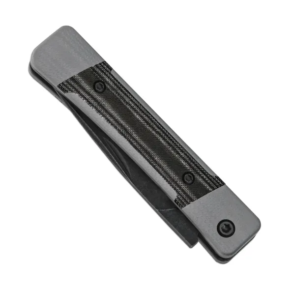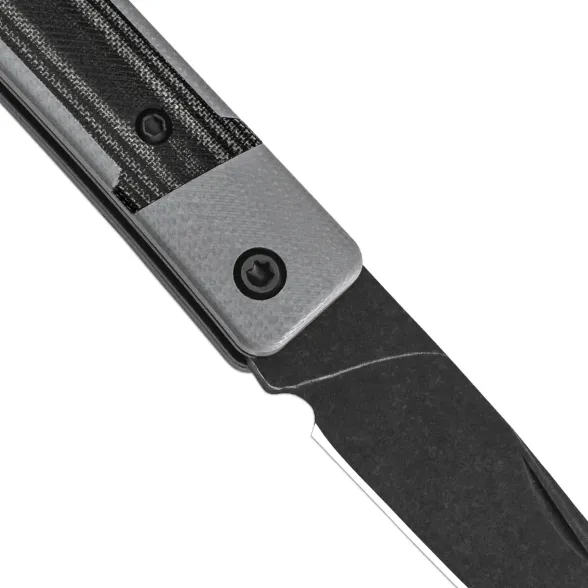 Рукоять выполнена из стеклотекстолита G10 - прочного, лёгкого и устойчивого к влаге материала, широко применяемого в премиальных ножах. В качестве декоративной вставки используется микарта, известная своей текстурой и теплым тактильным ощущением. Такое сочетание не только визуально напоминает строгий костюм с контрастной отделкой, но и обеспечивает надёжный хват даже во влажной руке.