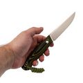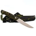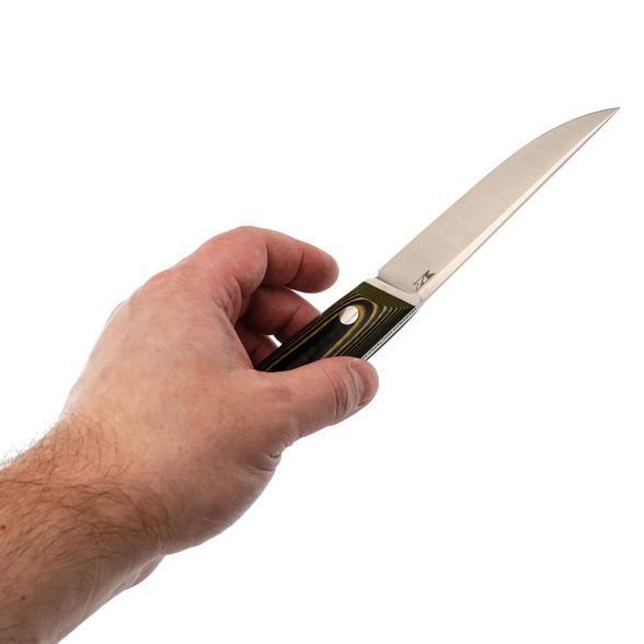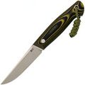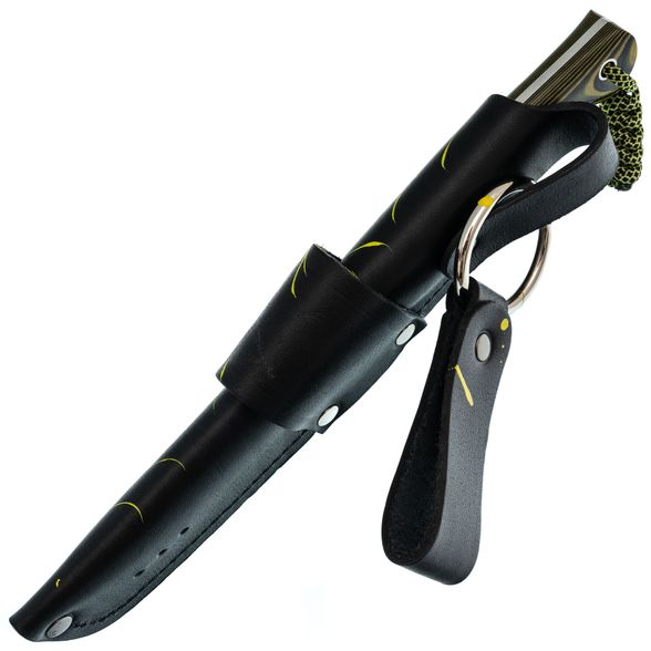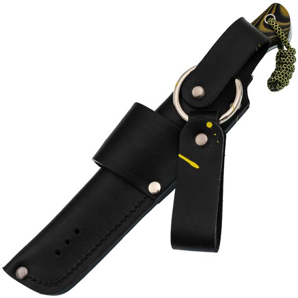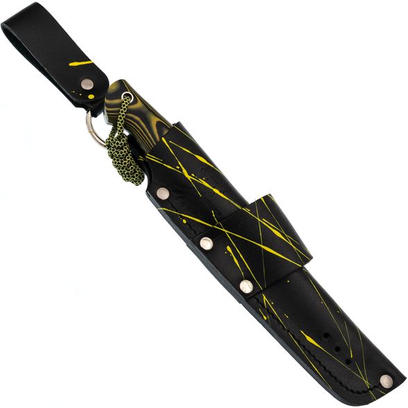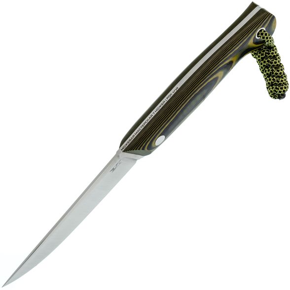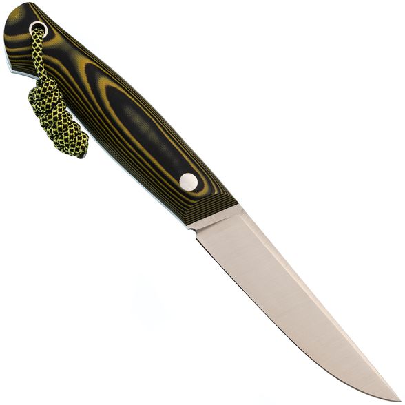Рукоять выполнена из слоями прессованного стеклотекстолита G10, отличающегося высокой прочностью, водостойкостью и стабильностью. Черно-желтый цвет добавляет модели выразительности. Пухлая форма рукояти без упоров обеспечивает комфортное удержание и свободу движений, ничто не мешает работе. Цельнометаллический монтаж гарантирует долговечность, а наличие темлячного отверстия расширяет функциональность ножа.