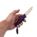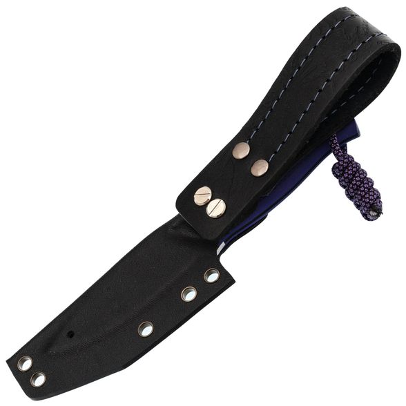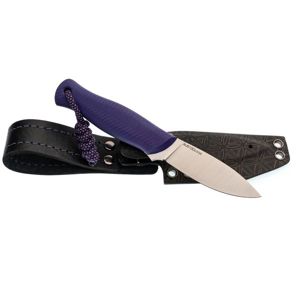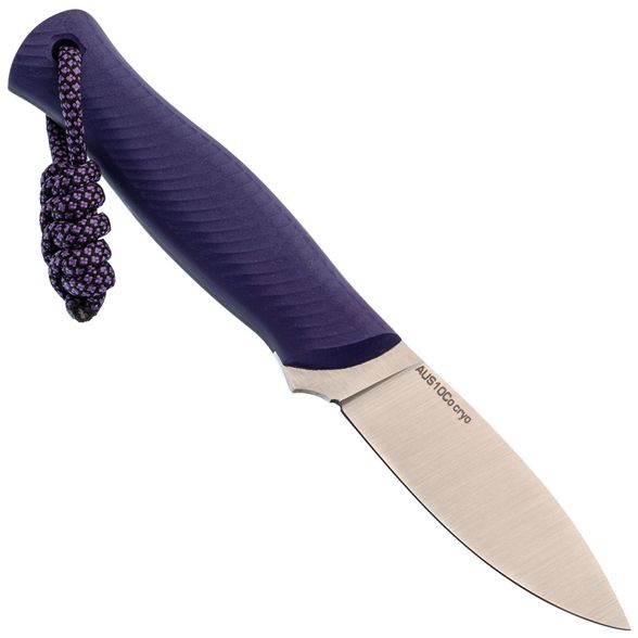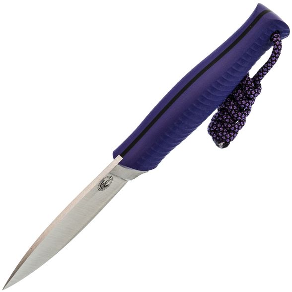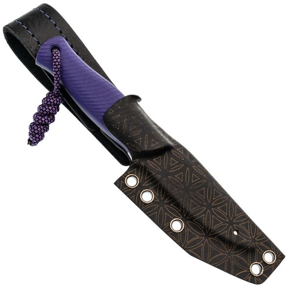 Рукоять изготовлена из G10 — прочного стеклотекстолита, который не подвержен воздействию влаги, не выцветает и не впитывает запахи. Этот материал сочетает лёгкость с высокой устойчивостью к механическим повреждениям, что делает его одним из лучших вариантов для ножевых рукоятей. Фрезеровка на рукояти обеспечивает надёжный хват, препятствуя выскальзыванию даже во влажных условиях. Цельнометаллический монтаж повышает прочность конструкции и упрощает обслуживание ножа. Рукоять выполнена в редком фиолетовом цвете и оснащена темлячным отверстием, что позволяет закрепить темляк для удобства ношения.