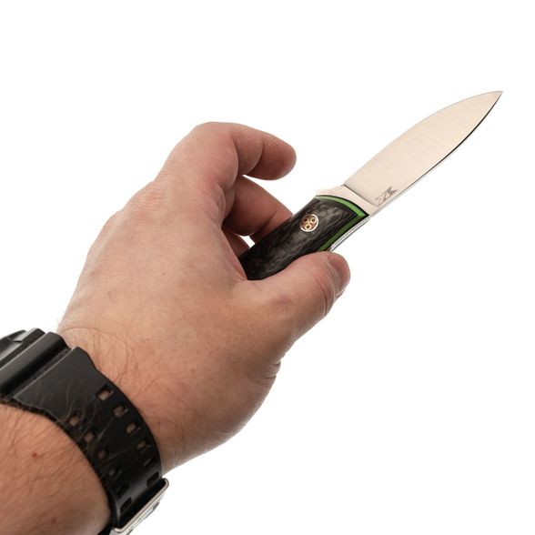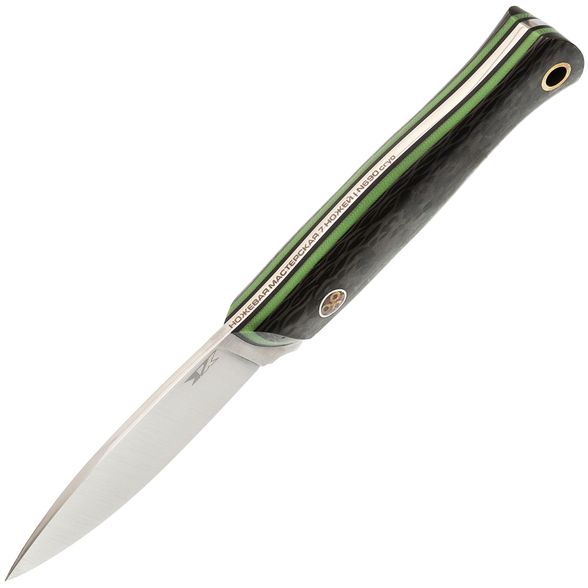 Рукоять ножа "Колибри" впечатляет своим дизайном и функциональностью. Она имеет монтаж Full-Tang, что обеспечивает прочность и устойчивость. Накладки на рукоять изготовлены из прочного ламината G10 и карбона, что делает их легкими и долговечными. Верхнюю накладку из карбона монтируют на стеклотекстолит, создавая уникальный и красивый внешний вид.