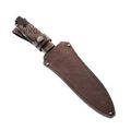 Комплектные ножны выполнены из толстой натуральной кожи с полусвободным подвесом, что делает ношение удобным как в походных условиях, так и в городе. Фиксирующий хлястик надёжно удерживает инструмент, исключая случайное выпадение. Материал прошёл качественную обработку - кожа не теряет форму и сохраняет эстетичный вид даже при активной эксплуатации.
