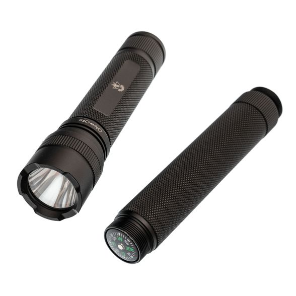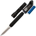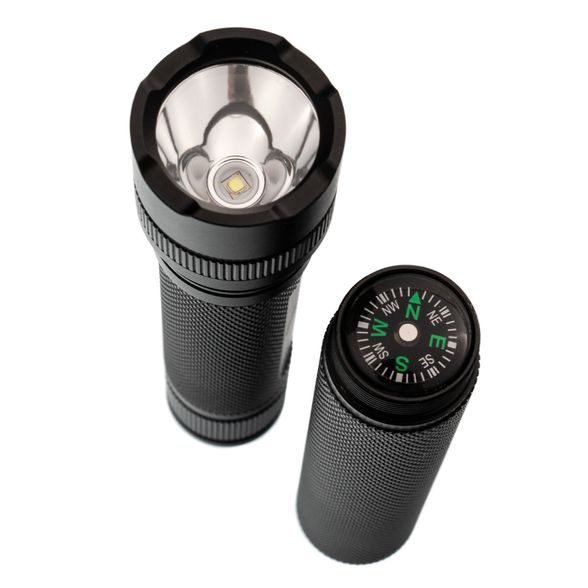 Нож Спелеолог включает в себя о функциональный нож с тонким клинком, а также мощный фонарик и компас.