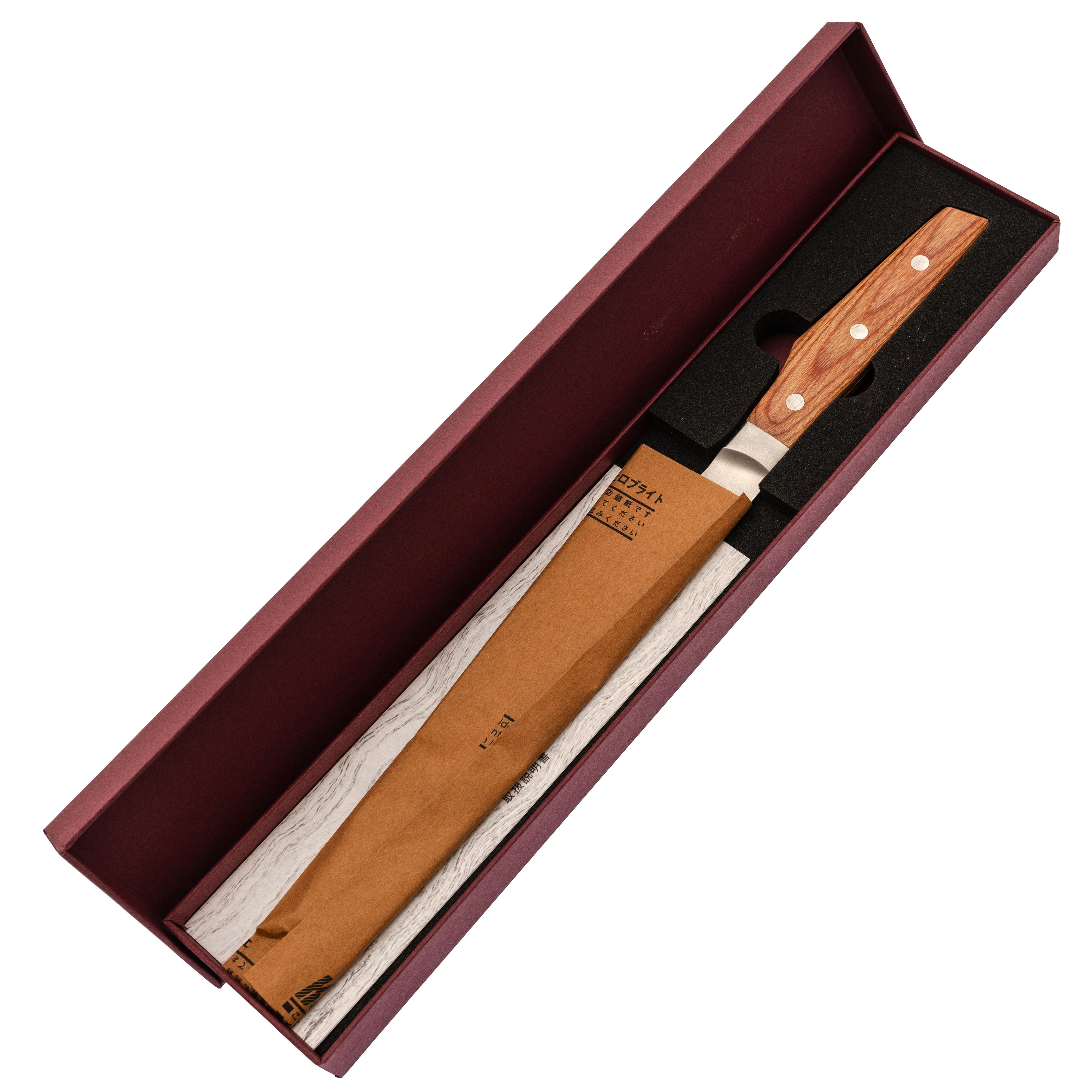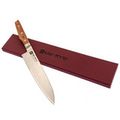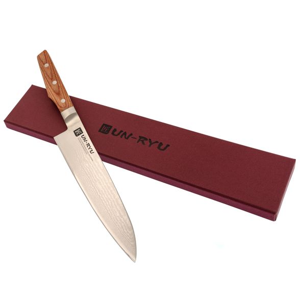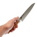 Рукоять из стабилизированной древесины имеет лёгкий изгиб под поварской хват и комфортно заполняет ладонь. Форма позволяет одинаково уверенно работать и в классическом, и в поварском. Бесшовный переход клинка в больстер и рукоять делает нож более гигиеничным: нет щелей, где могла бы скапливаться влага или остатки продуктов, нож проще промывать и вытирать насухо. В результате крупный Gyuto от Shimomura ощущается управляемым инструментом, с которым можно спокойно готовить и повседневные блюда, и сложные ужины для гостей.