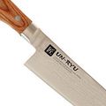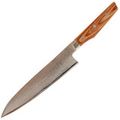 Крупный шеф Gyuto от Shimomura создан в духе современной японской кухни: максимум контроля, минимум лишних усилий. Gyuto - это японский взгляд на классический шеф-нож: высокий тонкий клинок для длинного тянущего реза, аккуратной шинковки и точной работы кончиком. Само название Gyuto ("говяжий клинок") отсылает к его корням - работе с крупными кусками мяса, а сегодня такой формат уверенно закрывает большинство задач на домашней и профессиональной кухне: от овощей и зелени до рыбы и филе.