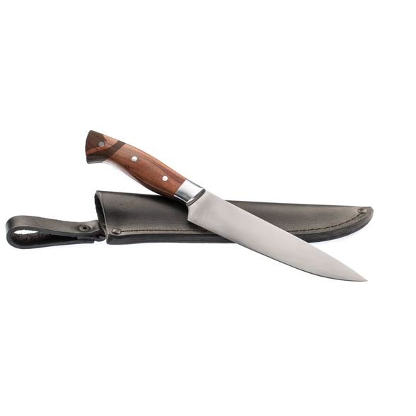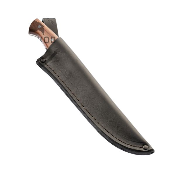 Рукоять выполнена из дерева коричневого цвета и пропитана маслом с особым составом, поэтому не скользит в руке, увеличивая травмобезопасность. Нож не требует индивидуального ухода, но после использования необходимо тщательно мыть все элементы. Клинок идет в наборе с удобным темным чехлом.