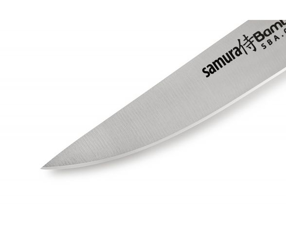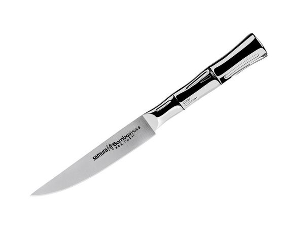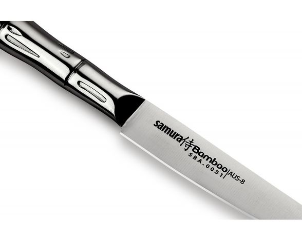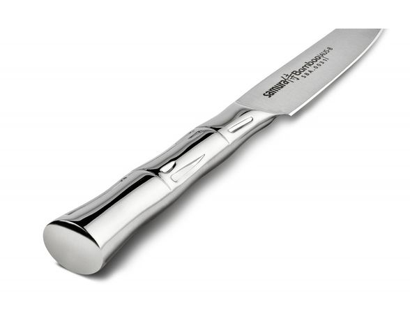 Samura Bamboo - кухонные ножи из современной однослойной японской стали твердостью 57-59 ед HRC. Уникальная металлическая рукоятка в форме бамбука препятствует скольжению и абсолютно гигиенична. Ножи Samura Bamboo можно использовать не только дома, но и в профессиональном секторе HoReCa, так как ножи соответствуют всем нормам СЭС для кухонных ножей, используемых на кухнях кафе и ресторанов. Эти ножи можно мыть в ПОСУДОМОЙКЕ. Полноценный стальной клинок от лезвия до хвостовика, тонкий обух и легкость ножа, японская эргономичная форма - все это существенно облегчает работу ножом и доставляет максимум удовольствия!