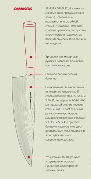 Влаго- и термостойкий композитный материал из которого изготовлена рукоять модели ножа Samura Damascus SD-0085, комфортно ложится в ладонь, не впитывает запахи продуктов, не скользит в мокрой руке и устойчив к различного рода агрессивным средам.