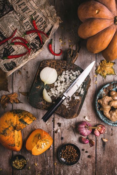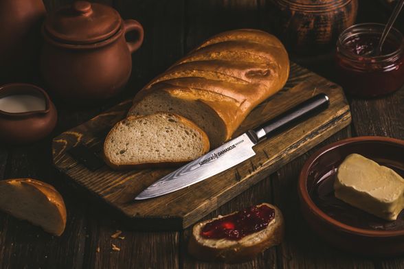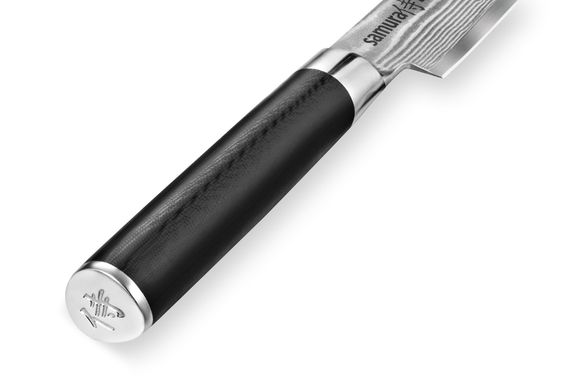 Профессиональный цельный нож; острый, тонкий клинок. Центральный слой из стали VGold-10 дает отличный рез и длительную остроту. Дамасские обкладки SUS 430 и SUS 431 придают большую упругость и не дают центральному слою ломаться. Эргономичная рукоятка из влаго- и термостойкого материала G-10. Заточка двусторонняя