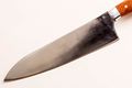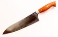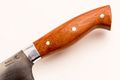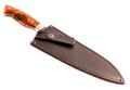 Рукоять эргономичной формы изготовлена из дерева Бубинго, поэтому не впитывает запахи и не боится воздействия влаги и моющих средств. Для увеличения срока службы нож оборудован больстером, защищающим рукоять от внешних воздействий. В комплект включен кожаный чехол для транспортировки, помогающий сохранить клинок в первозданном виде.