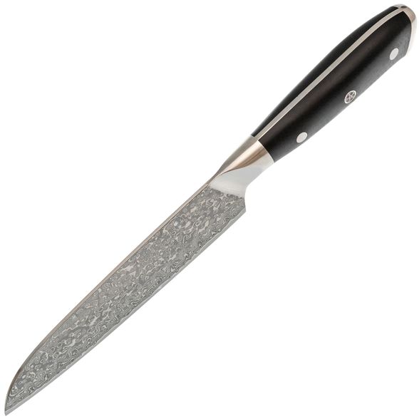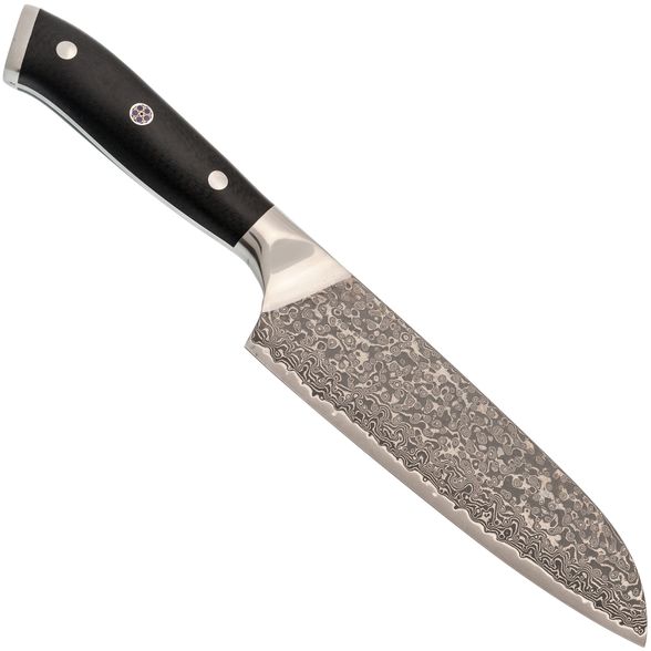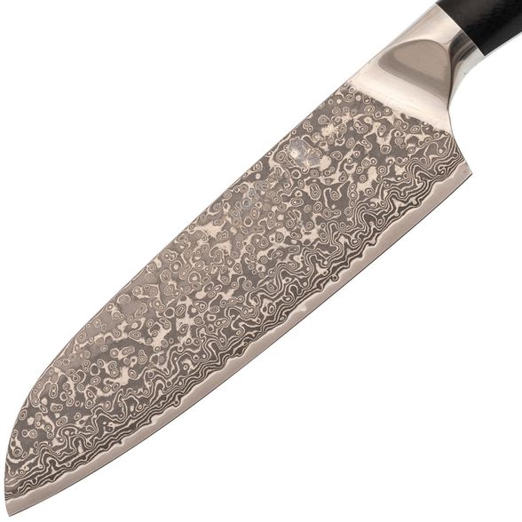 Клинок ножа сантоку от Tuotown изготовлен из уникального ламината, что обеспечивает его превосходные характеристики. В его основе лежит сталь VG-10, известная своей высокой твердостью и способностью долго держать заточку. Эта сталь используется в качестве сердечника, а обкладки выполнены из красивого и прочного дамасского слоя. Такое сочетание материалов делает клинок не только прочным, но и придает ему стильный внешний вид с уникальным узором.
