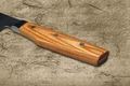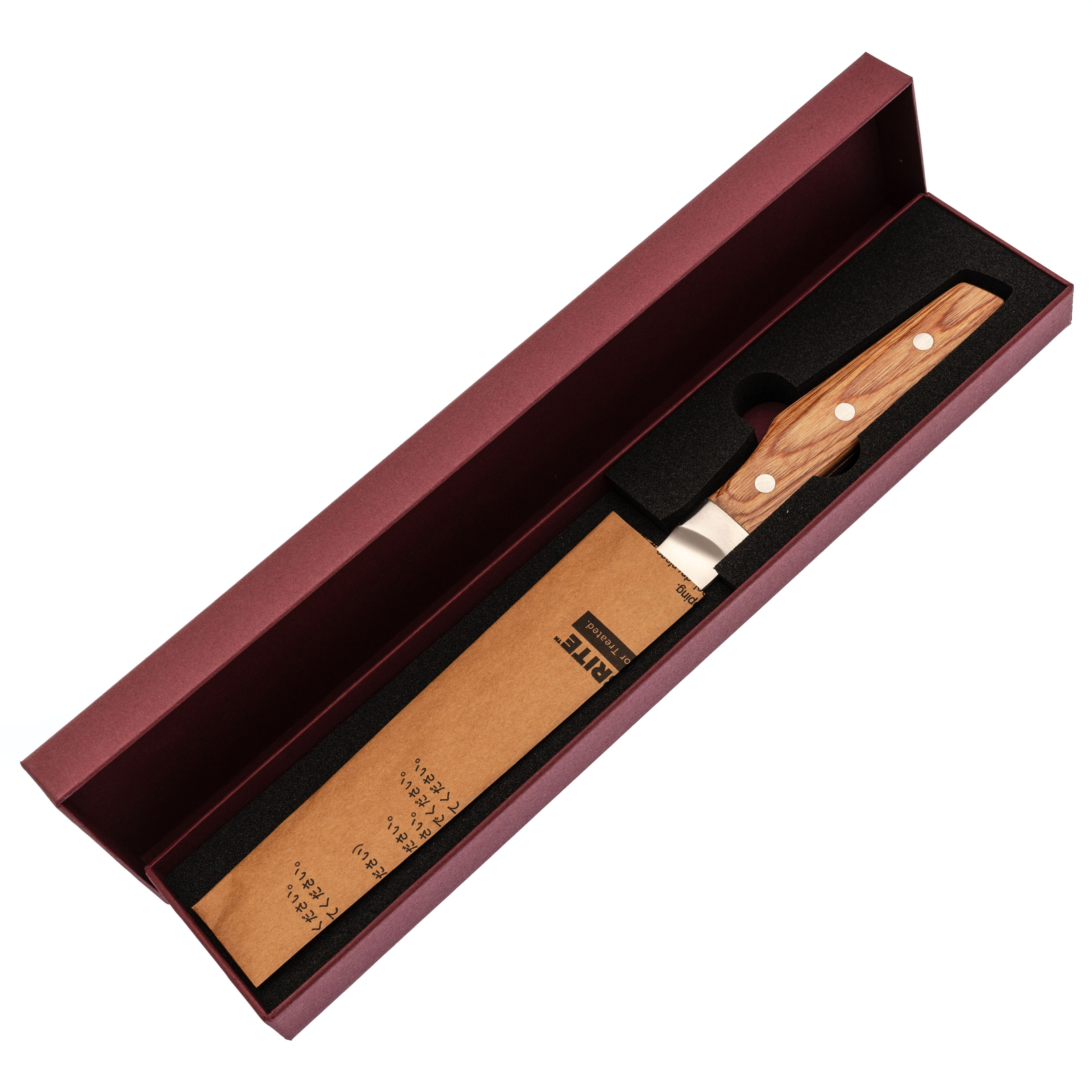 Рукоять из стабилизированной древесины имеет лёгкий изгиб под поварской хват, поэтому нож естественно ложится в ладонь и не норовит провернуться во время работы. Бесшовный переход клинка в больстер упрощает гигиенический уход: на стыках не задерживаются остатки продуктов, нож удобно мыть и вытирать. Эргономичная форма снижает нагрузку на пальцы и запястье, так что им можно долго резать и шинковать без ощущения усталости.