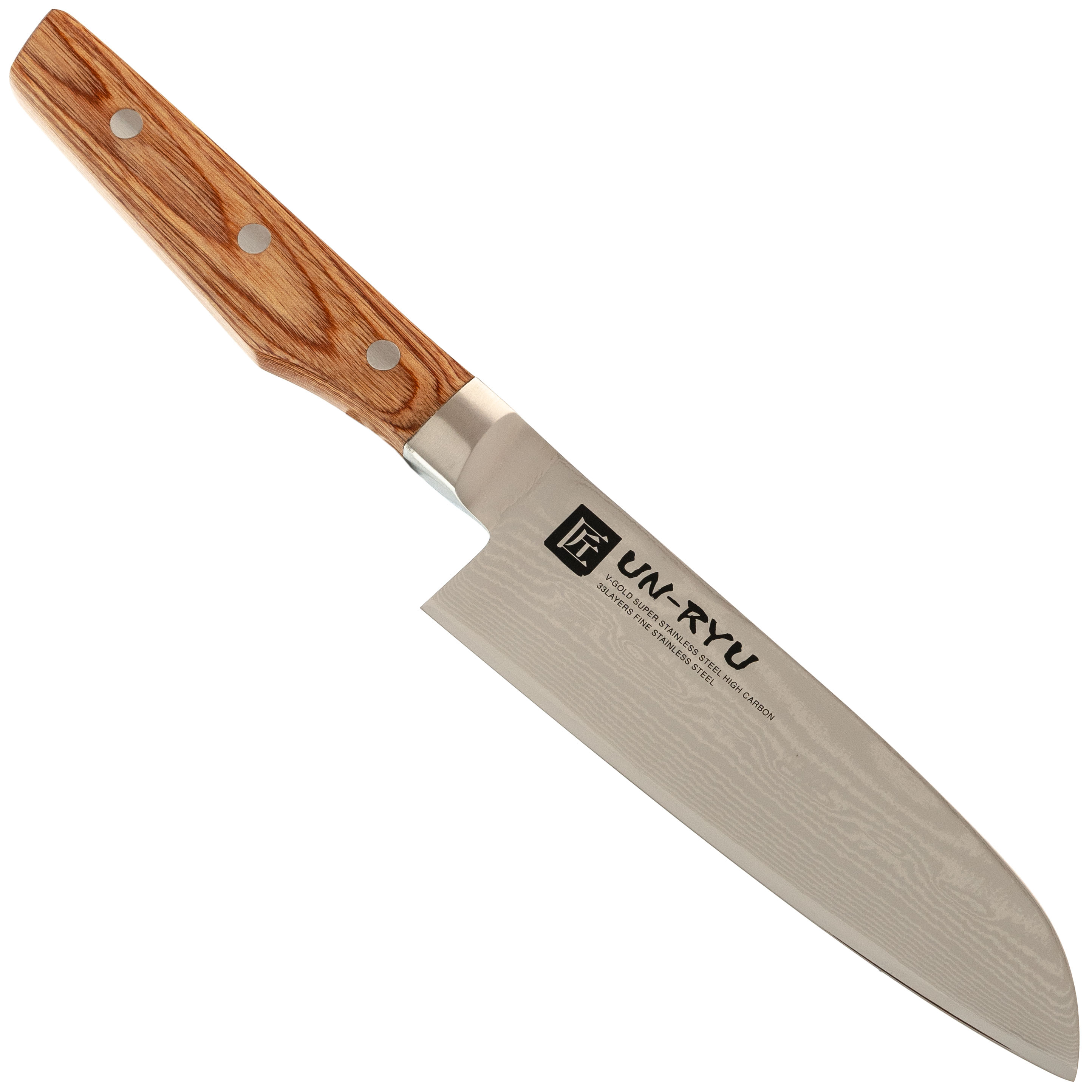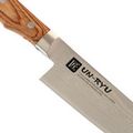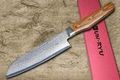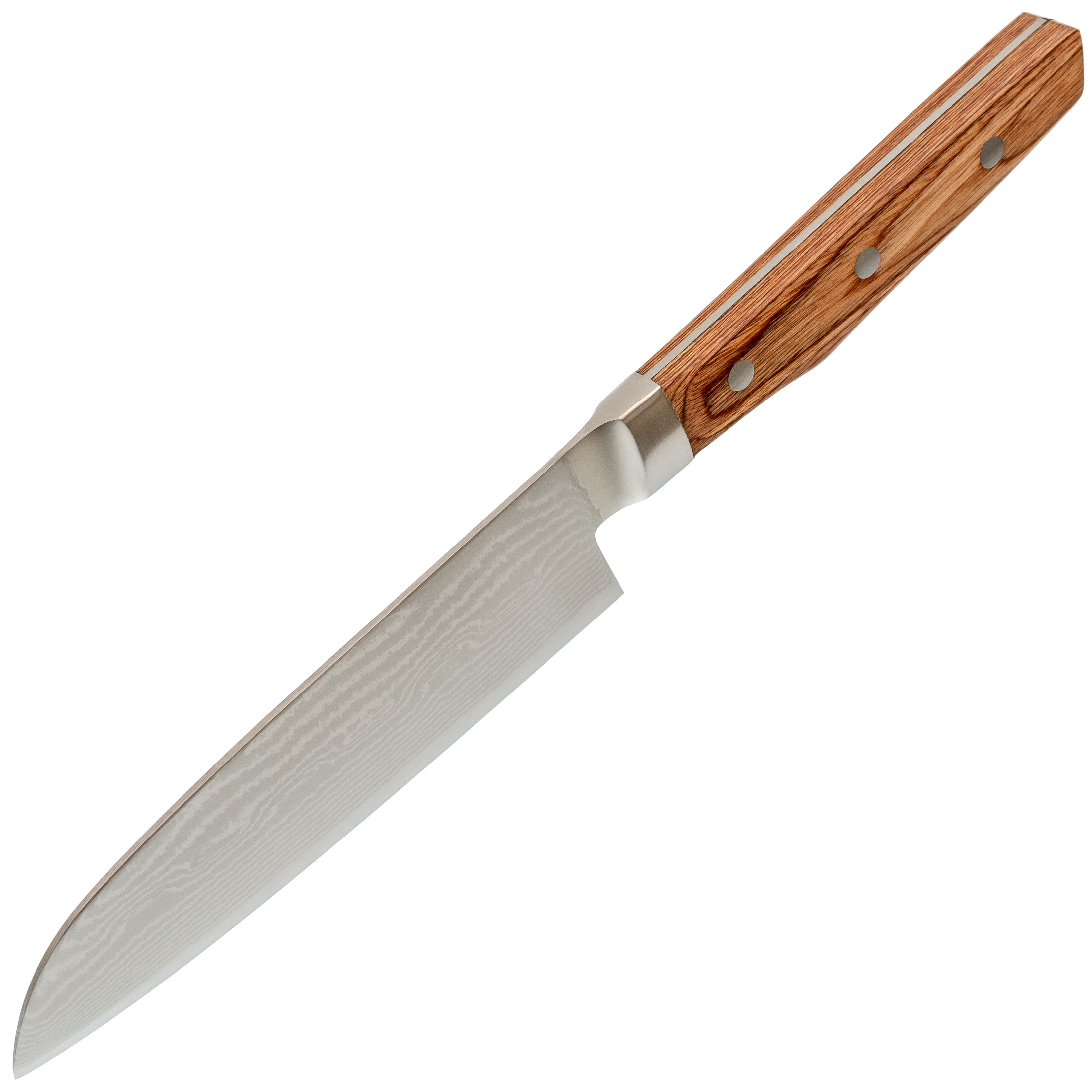 - Дамасские обкладки - многослойный металл по сторонам сердечника добавляет клинку устойчивость к нагрузкам и даёт характерный волнистый рисунок, который ассоциируется с традиционными японскими кухонниками.