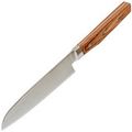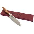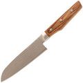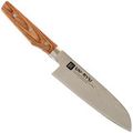 Кухонный шеф сантоку Shimomura - нож средних размеров, который уверенно чувствует себя и на домашней кухне, и в руках увлечённого кулинара. Формат сантоку изначально задуман как универсал для трёх базовых задач: нарезка, шинковка и рубка. Клинок достаточно длинный, чтобы работать с крупными продуктами, и при этом не громоздкий - им удобно орудовать на обычной разделочной доске, не уставая и не чувствуя лишнего веса.