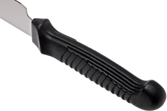 Высокопрочная рукоять, из полипропилена Sermollan черного цвета, рассчитана на повышенные нагрузки, долгую службу и противодействие бактериям, для которых кухня – это среда обитания. Текстура рукоятки состоит из ярко выраженных продольных и поперечных волн, сделанных для удобного хвата и противодействию выскальзывания ножа.