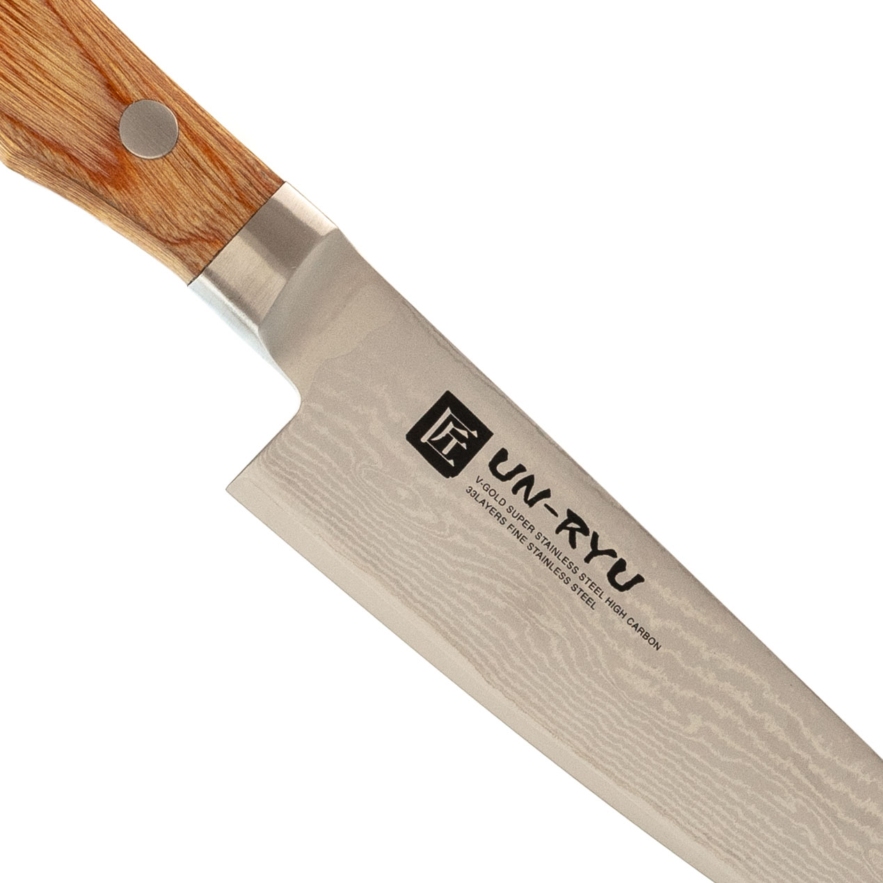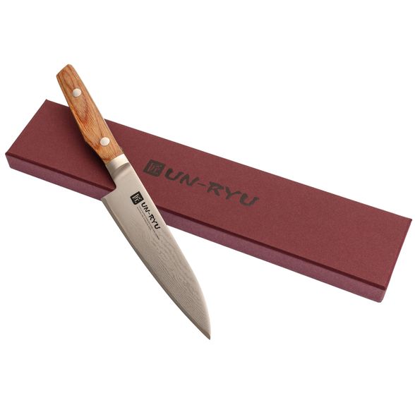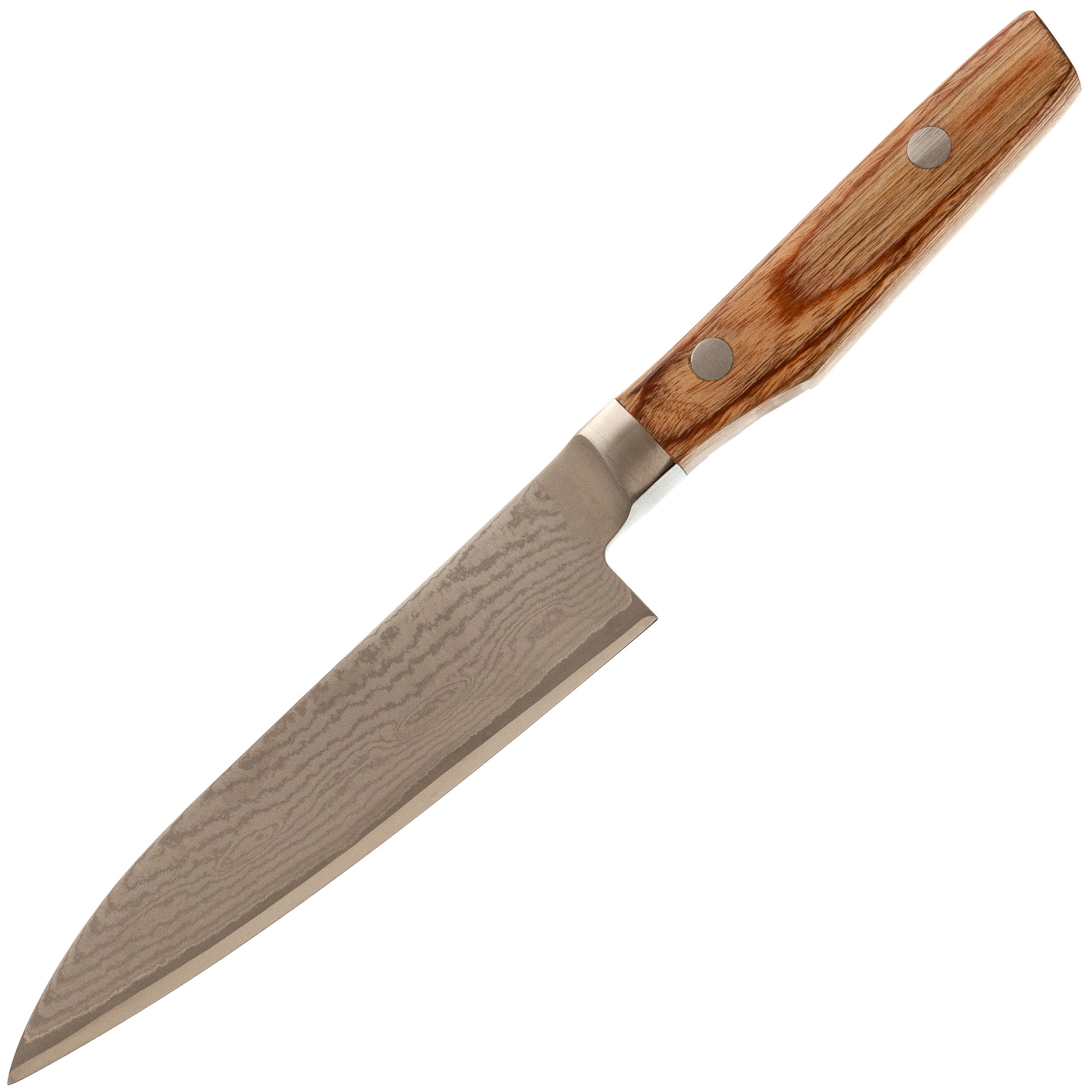 Ламинированный клинок и рукоять из стабилизированной древесины подобраны с прицелом на ежедневную кухонную нагрузку: