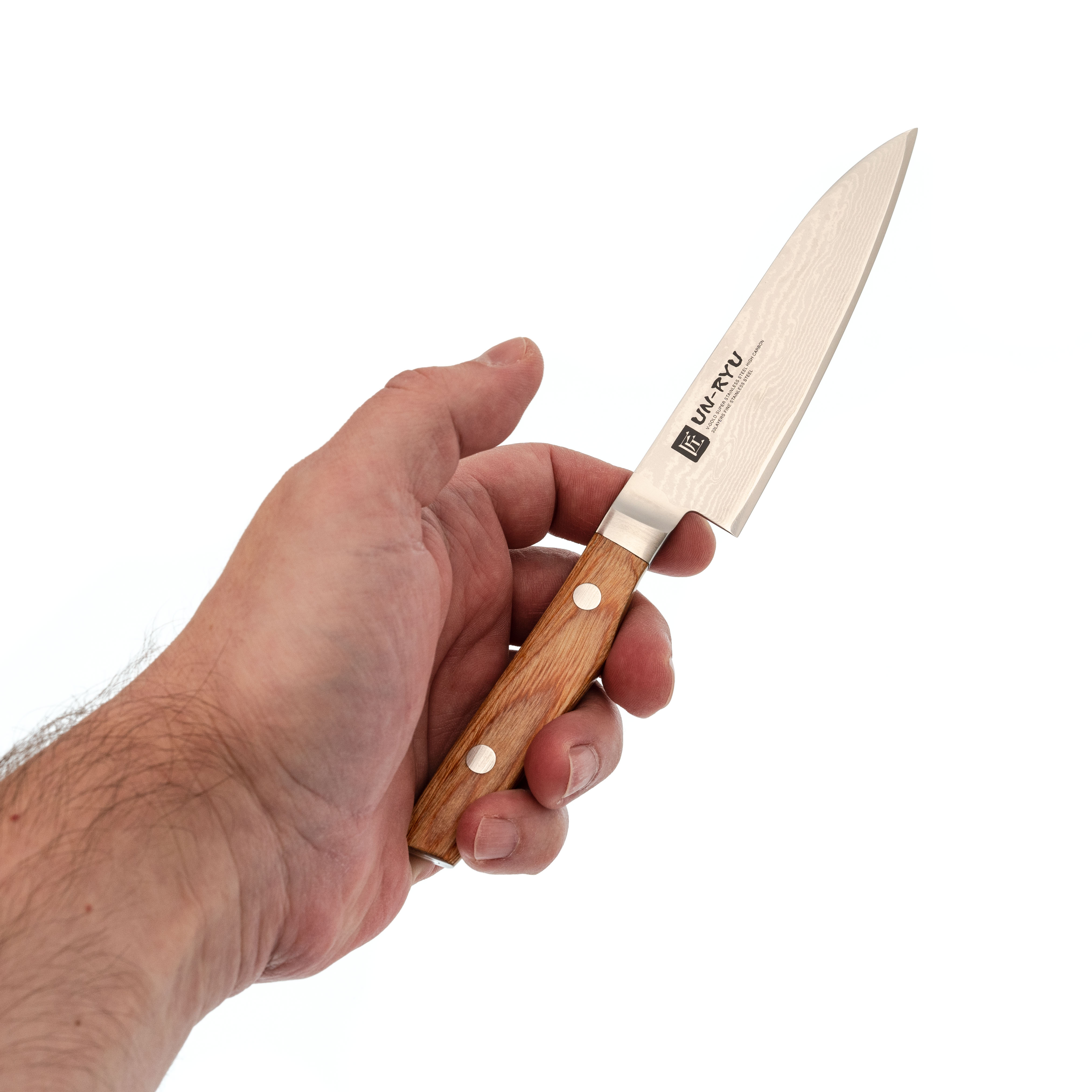 Компактный овощной нож японского производства от Shimomura берёт на себя всю мелкую работу на кухне. Он чистит и нарезает овощи, аккуратно режет фрукты, зелень и мелкие продукты, когда шеф уже кажется избыточным. Японские мотивы в геометрии и форма дают удобный контроль как при быстрой нарезке на доске, так и при ювелирной работе в руках.