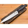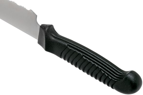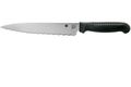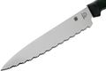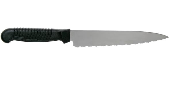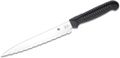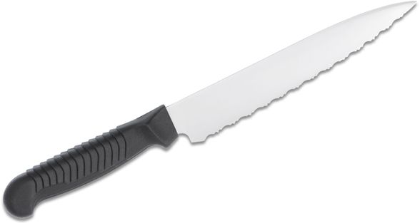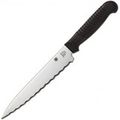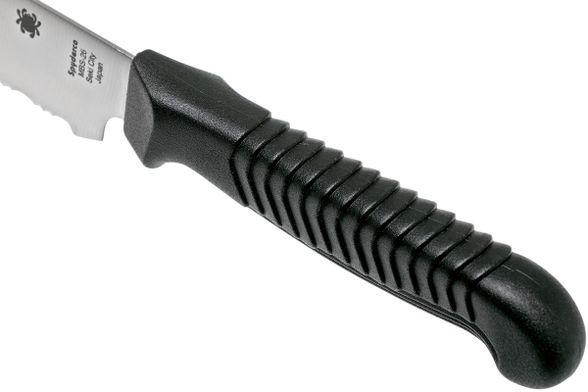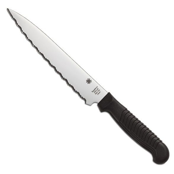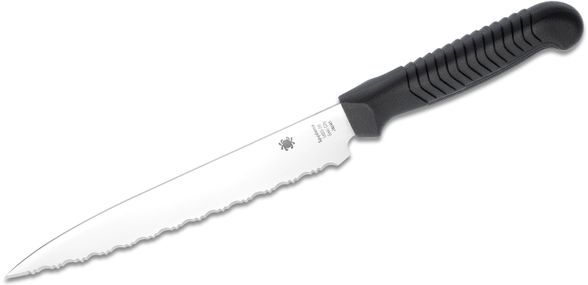 Spyderco Utility Knife Serrated K04SBK – это универсальный кухонный нож с клинком из нержавеющей стали MBS-26, длиной 16,5 см, с классической формой Drop Point, и серрейторной режущей кромкой. Эта модель располагает фирменной заточкой лезвия SpyderEdge, с уникальным двух-ступенчатым профилем серрейтора, который защищает грань от притупления об разделочные доски. Его назвали Utility – полезный – отражает его суть так, как он предназначен для выполнения любой кухонной работы. Размер, острота и долговечность сделали нож Spyderco K04SBK одним из популярнейших инструментов на домашних и профессиональных кухнях всего мира. Исключительно тонкое сведение граней и бритвенная заточка серрейторной режущей кромки сможет исполнить любую прихоть владельца с поразительной быстротой. Высокопрочная рукоять, из полипропилена Sermollan черного цвета, рассчитана на повышенные нагрузки, долгую службу и противодействие бактериям, для которых кухня – это среда обитания. Текстура рукоятки состоит из ярко выраженных продольных и поперечных волн, сделанных для удобного хвата и противодействию выскальзывания ножа. Нож Spyderco Utility Knife Serrated K04SBK, благодаря своему ультратонкому и гибкому лезвию, легко справляется с любым видом продуктов, будь то мягкие или волокнистые ткани, крохкие или вязкие ингредиенты
