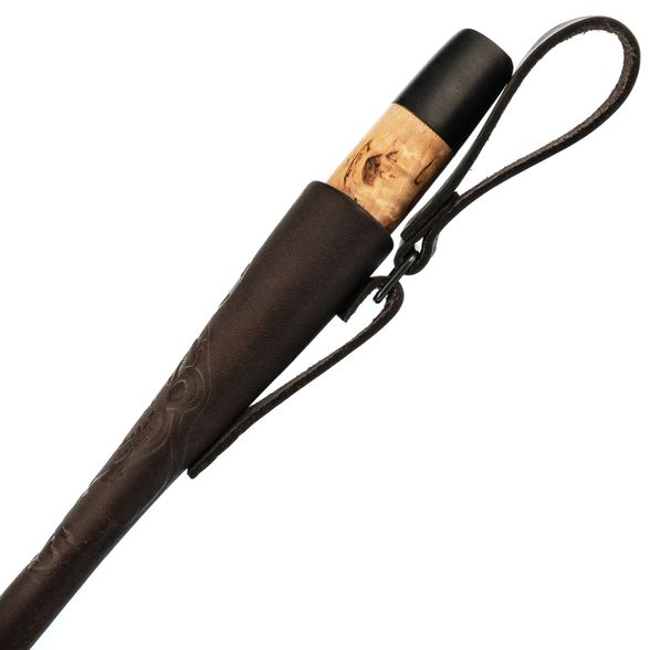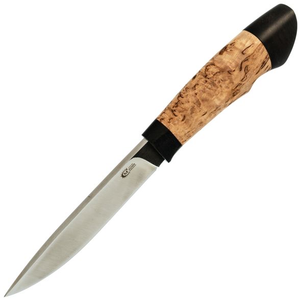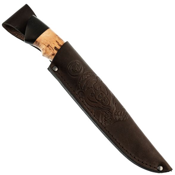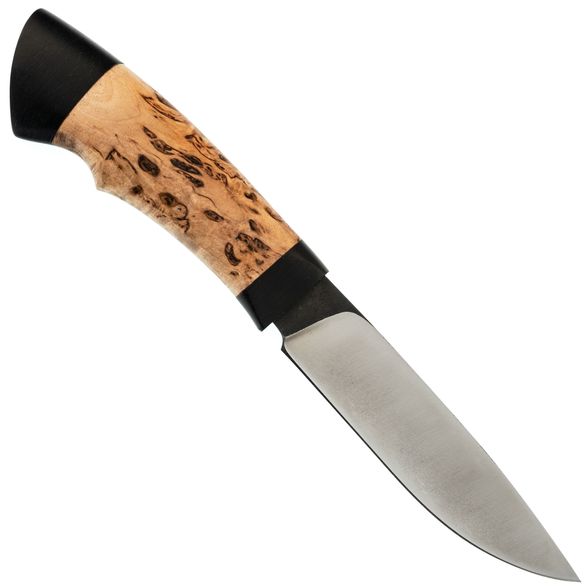 Рукоять ножа изготовлена из древесины карельской березы и граба, что обеспечивает оптимальный баланс между прочностью и легкостью. Ее форма удобно ложится в руку и хорошо заполняет руку, обеспечивая уверенный и комфортный хват. Изгиб рукояти обеспечивает дополнительное удобство и контроль во время использования.
