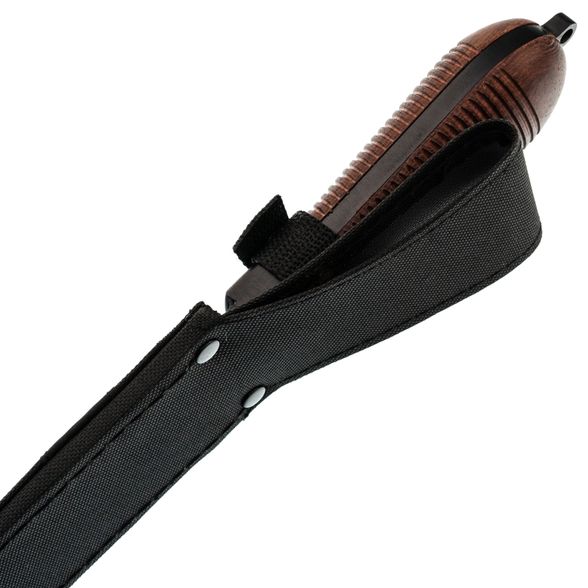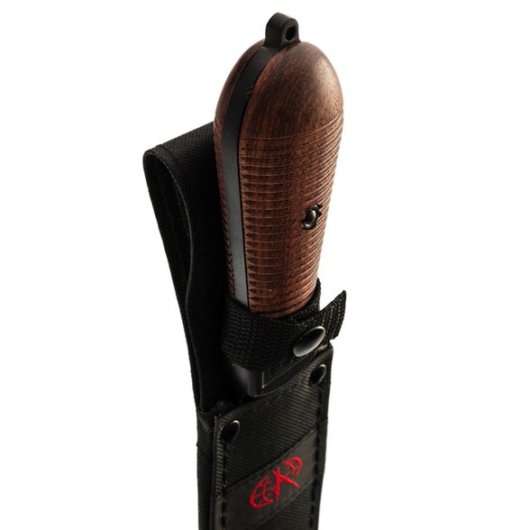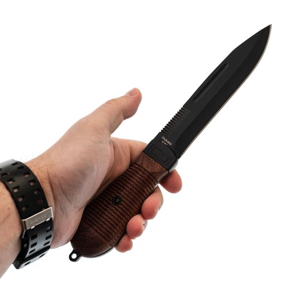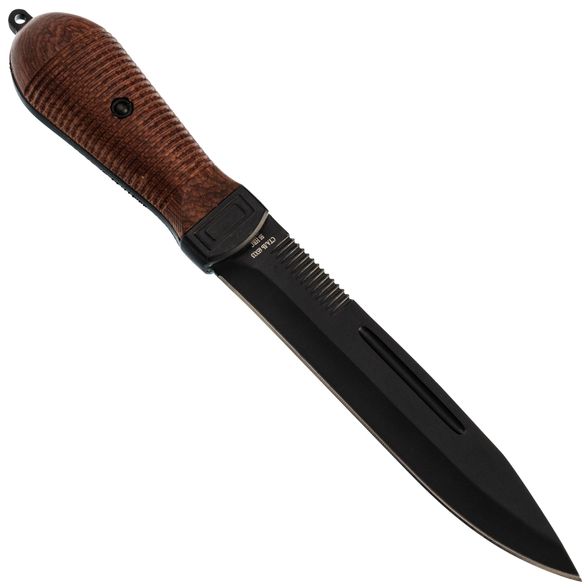 Лезвие ножа изготовлено из высококачественной стали 65х13, которая отличается высокой ударопрочностью. Эта простая нержавеющая сталь легко затачивается что позволяет быстро вернуть остроту по необходимости. Толщина клинка составляет 5 мм, а его спуски выполнены с минимальным уклоном, что обеспечивает надежность в использовании, пускай и рез у ножа будет не самым эталонным.