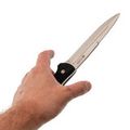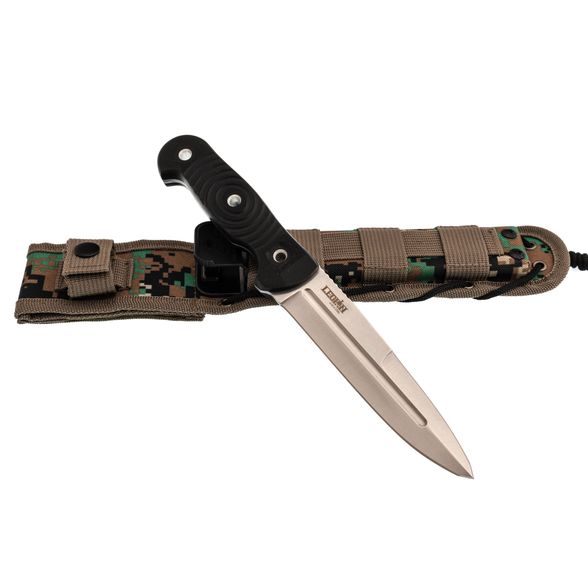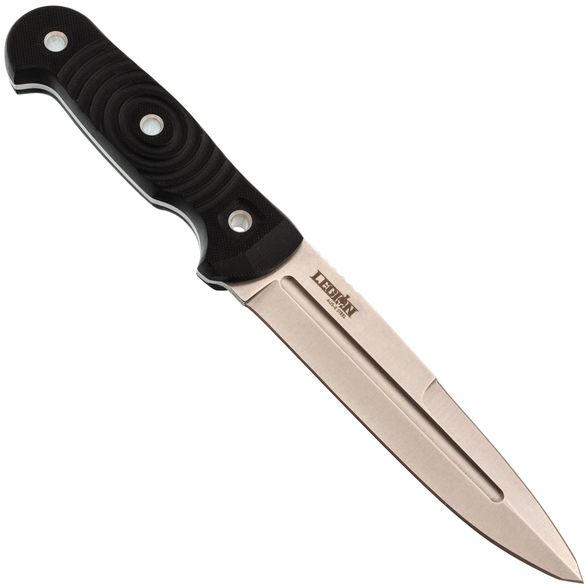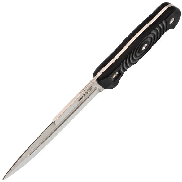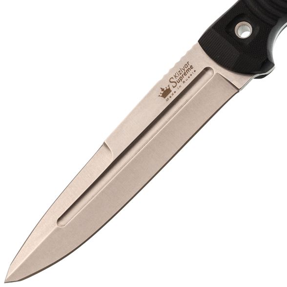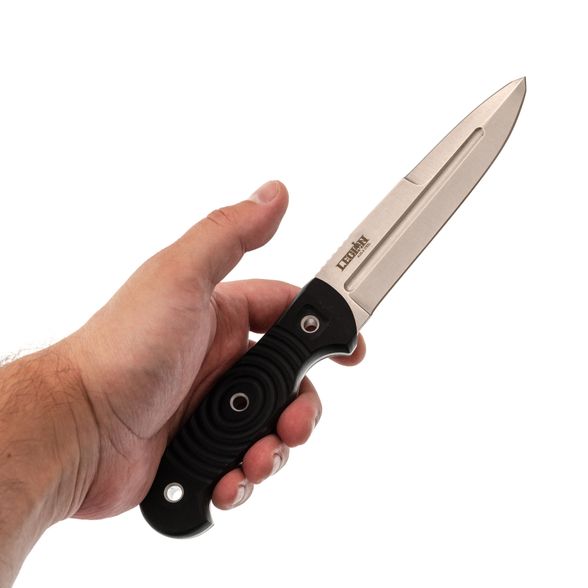 Рукоять ножа выполнена по технологии Full-Tang, что гарантирует его прочность и надежность. Накладки из стеклотекстолита G10, не боятся агрессивных условий эксплуатации и условий окружающей среды, что делает этот материал идеальным выбором для рабочего ножа в любых условиях. Фрезеровка накладок не только придает им стильный вид, напоминая круги воды, но и увеличивает цепкость при использовании.