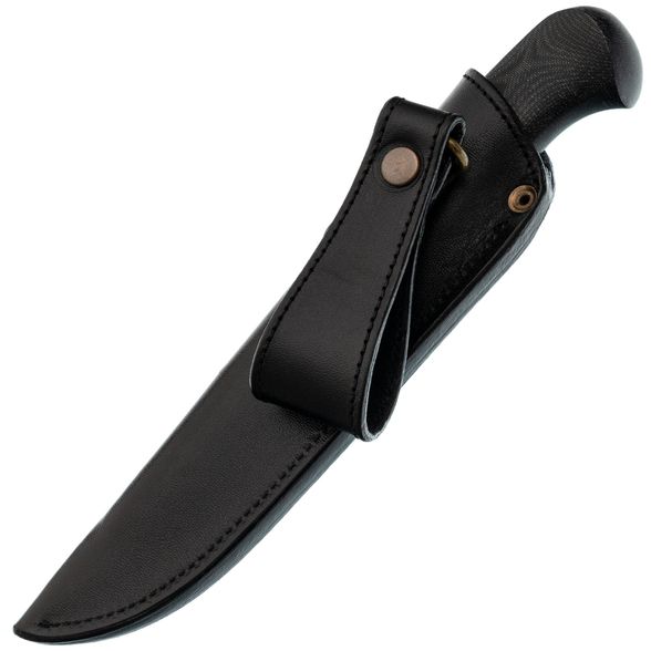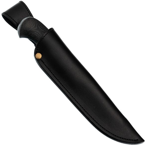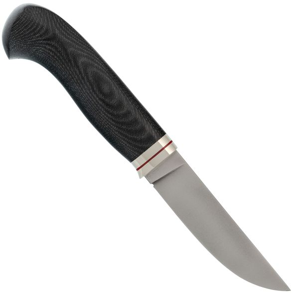 Рукоять выполнена из прочного и надёжного материала — микарты, которая известна своей высокой устойчивостью к влаге, перепадам температур и механическим воздействиям. Этот композит на основе текстиля и смолы не только долговечен, но и приятен на ощупь, обеспечивая уверенное сцепление даже во влажной ладони. Эргономичная форма с характерным для традиционных финок "грибком" позволяет удобно удерживать нож в любом хвате — будь то силовая работа или тонкая подрезка. Такая рукоять обеспечивает надёжность и комфорт даже при длительном использовании.