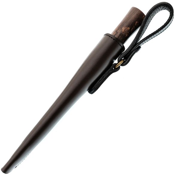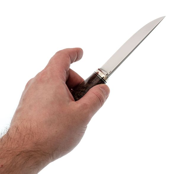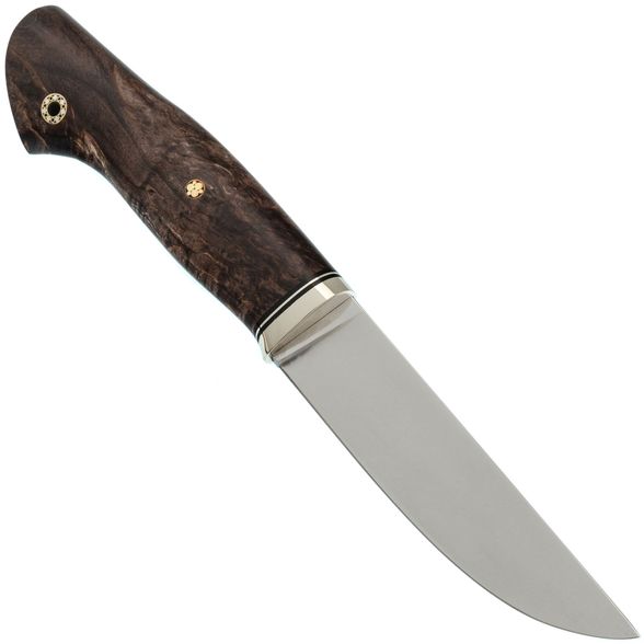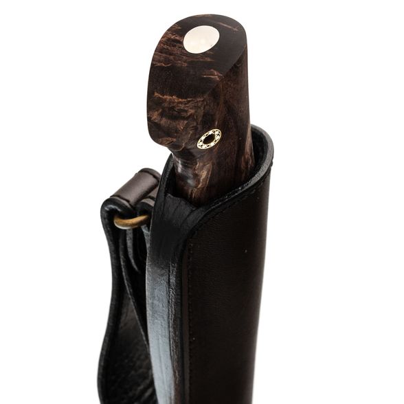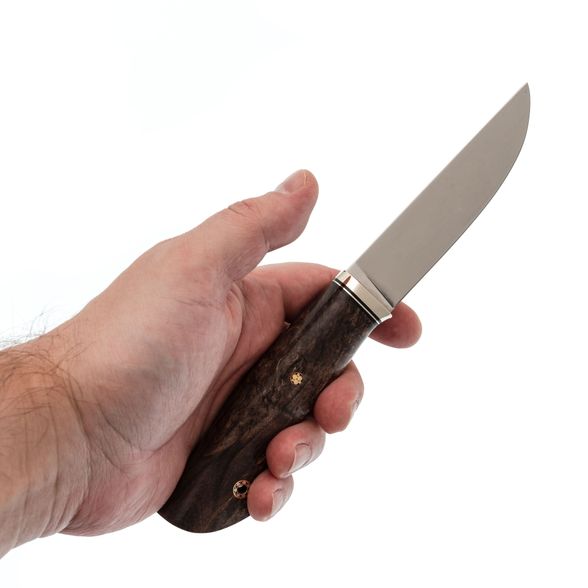 Рукоять изготовлена из стабилизированной карельской берёзы, что придаёт ей не только высокую прочность, но и повышенную устойчивость к внешним воздействиям. Стабилизация сохраняет природный рисунок древесных волокон, благодаря чему каждая рукоять получается уникальной. К тому же, проверенная временем эргономичная форма рукояти прекрасно заполняет руку, обеспечивая комфортное и безопасное использование ножа в течение длительного времени. Такая форма рукояти позволяет долго работать без усталости и дискомфорта.
