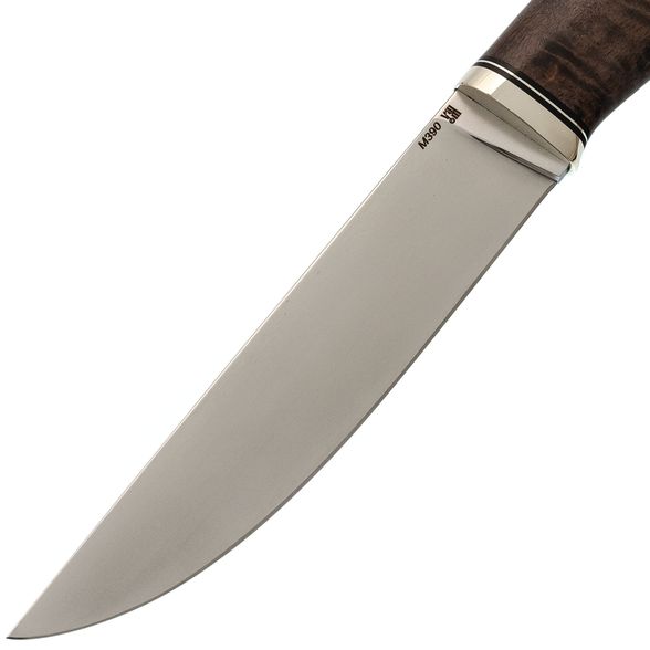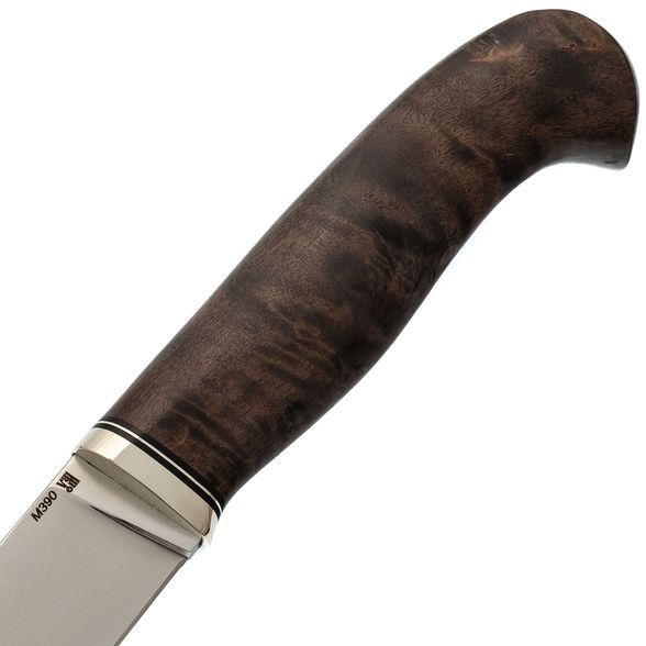- Клинок ножа изготовлен из стали M390 — одной из лучших современных порошковых сталей, известной своей износостойкостью, высокой твёрдостью и отличным удержанием режущей кромки. Эта сталь идеально подходит для интенсивного использования в полевых условиях и легко справляется с разделкой дичи без необходимости частой заточки.