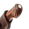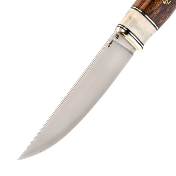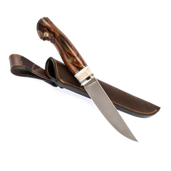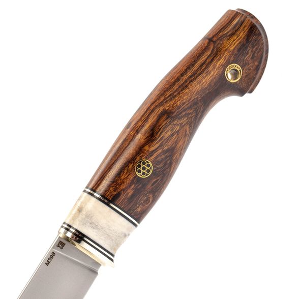 НОЖ ЛИДЕР 3, СТАЛЬ M398, ЖЕЛЕЗНОЕ ДЕРЕВО, ВСТАВКА РОГ ЛОСЯ обращает на себя внимание большим количеством интересных деталей. Его клинок выполнен из стали, которая обладает повышенным уровнем твердости. При правильной термической обработке нож удерживает заточку в течение длительного времени. Рукоятка ножа изготовлена из африканского железного дерева, которое также отличается высокой твердостью. Для повышения внешней ценности этой модели здесь используется вставка из рога лося, мозаичный пин и глубокий природный узор. Если помимо функциональной нагрузки вы обращаете внимание на внешнюю стилистику, то вам обязательно нужно более внимательно взглянуть на эту модель.
