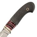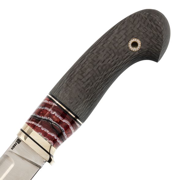 Рукоять выполнена из карбона - прочного и лёгкого материала, который ещё и выглядит хорошо. Объёмная форма отлично ложится в руку и не вызывает дискомфорта даже при долгой работе. Вдобавок, нож украшен вставкой из стабилизированного бивня мамонта, что придаёт ему особую роскошность.