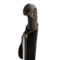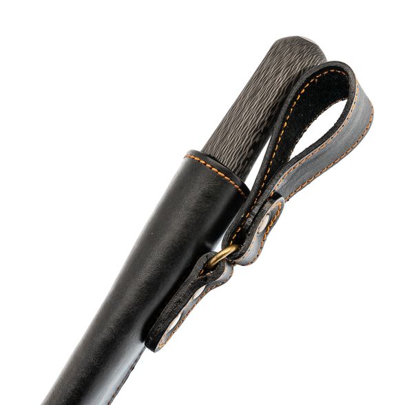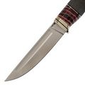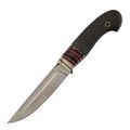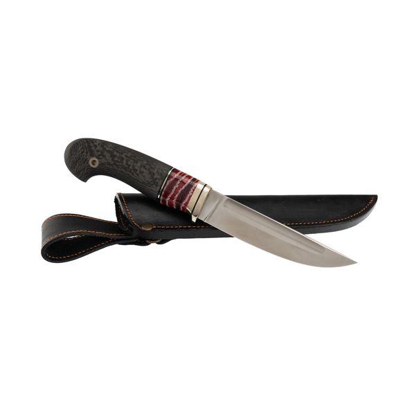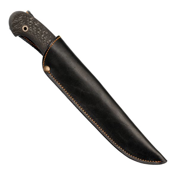 Комплектация данного ножа включает в себя качественные ножны из натуральной кожи, Свободный подвес которых обеспечивает удобство при передвижении по лесу.