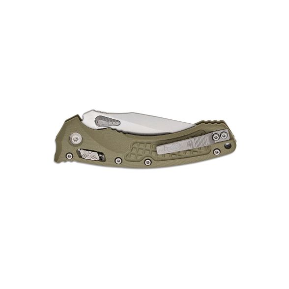 Клинок изготовлен из стали M390MK – улучшенной версии стали M390, созданной специально для Microtech концерном Bohler. Такая сталь обеспечивает длительное удержание остроты, высокую прочность и устойчивость к коррозии. Высокие прямые спуски способствуют точному срезу, а форма рекурвы удлиняет режущую кромку, не давая материалу соскальзывать. Для открытия клинка используются большие шпеньки с обеих сторон, оснащенные ступенчатой насечкой, что позволяет работать даже в перчатках.