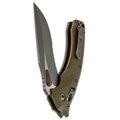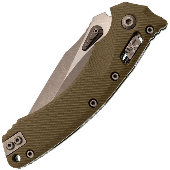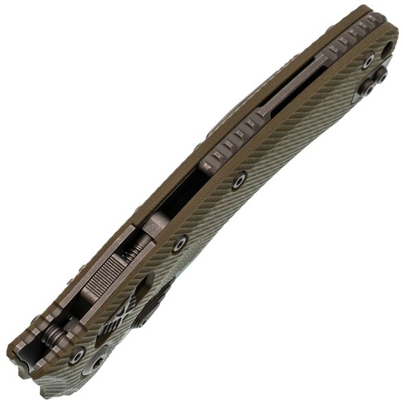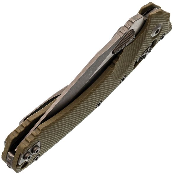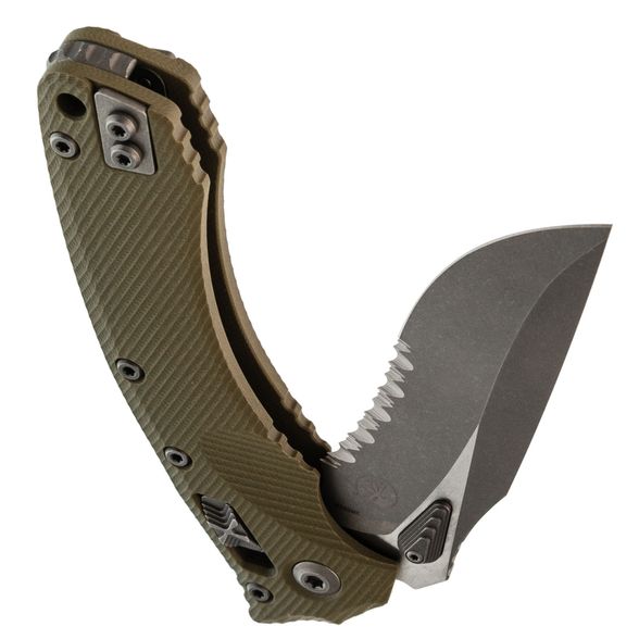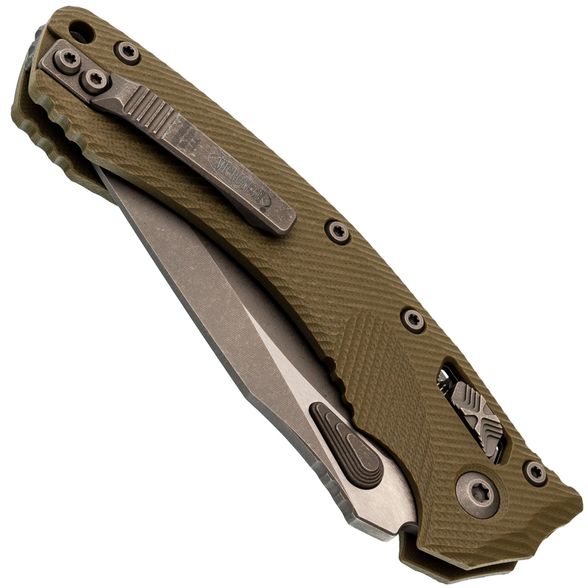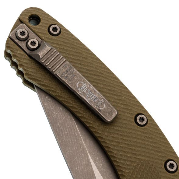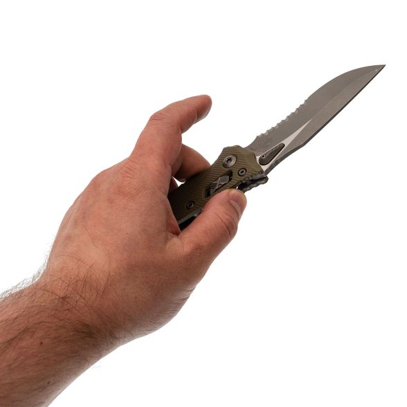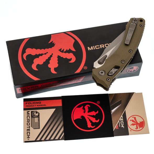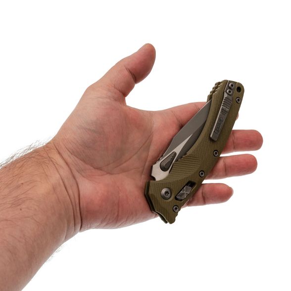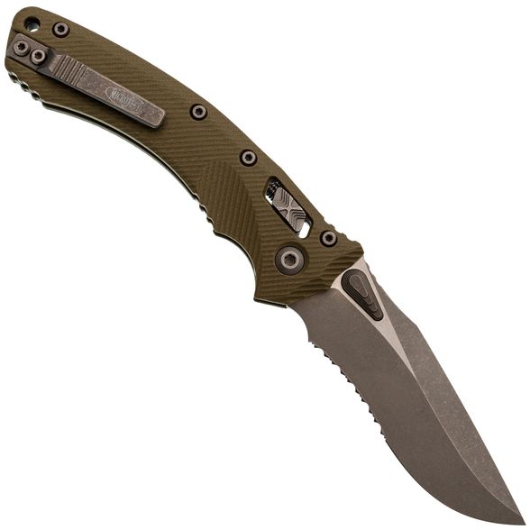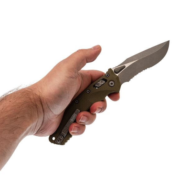 Лезвие изготовлено из стали M390MK – улучшенной версии стали M390, специально разработанной для Microtech в сотрудничестве с концерном Bohler. Эта сталь гарантирует длительное удержание остроты, высокую прочность и сопротивляемость коррозии. Высокие прямые спуски способствуют чистому резу, а форма рекурвы продлевает режущую кромку, предотвращая скольжение материала. Для открытия клинка используются большие шпеньки с обеих сторон, оснащенные ступенчатой насечкой. Дополнительно, серрейторная заточка делает участок режущей кромки крайне агрессивным, что идеально подходит для перерезания волокнистых материалов.