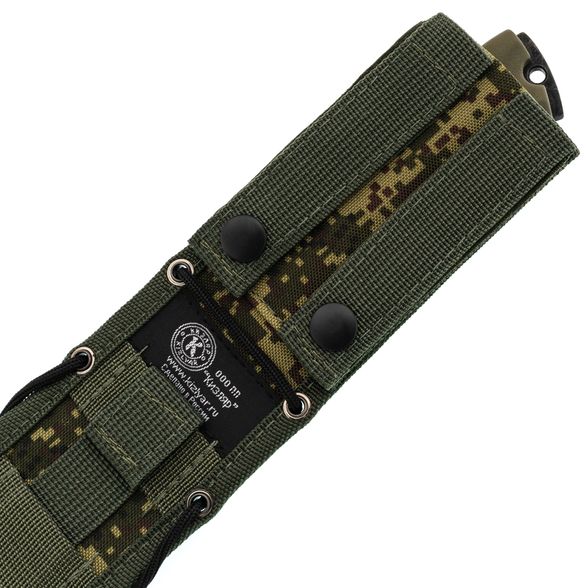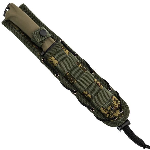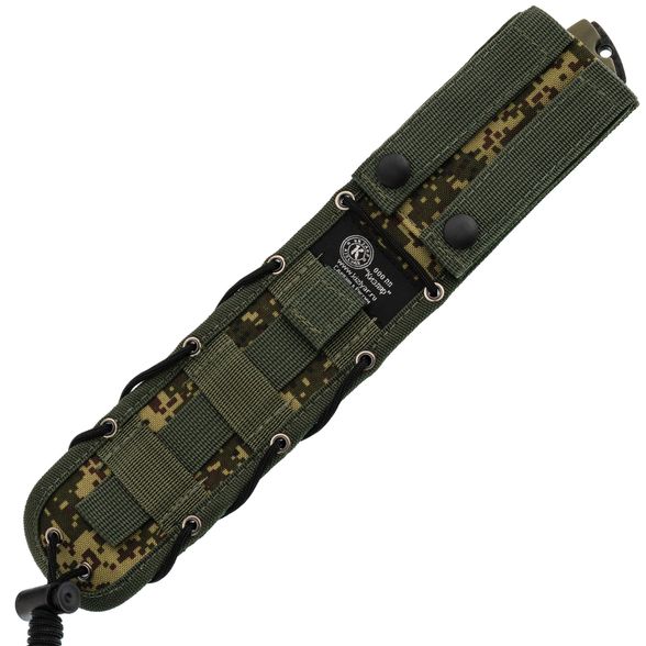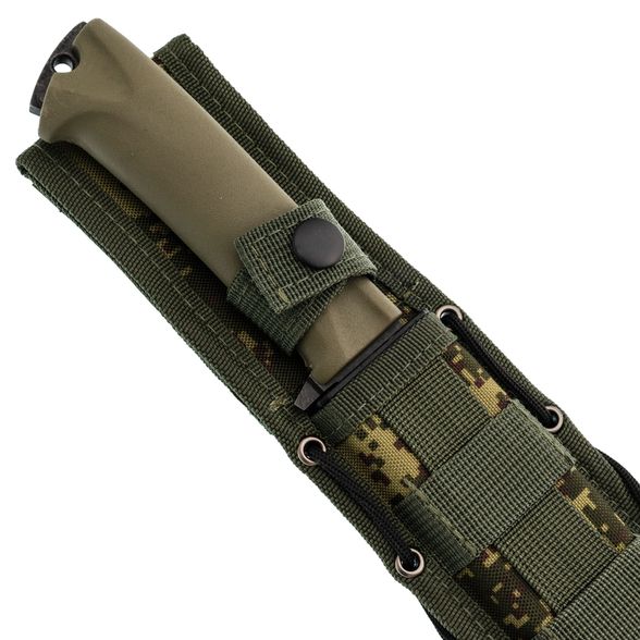 Ножны, выполненные из пластика, не боятся воды и экстремальных температур, хорошо защищая клинок. Пластиковая основа обтянута нейлоновым чехлом с Molle ячейками, что позволяет легко прикрепить ножны к разгрузке.