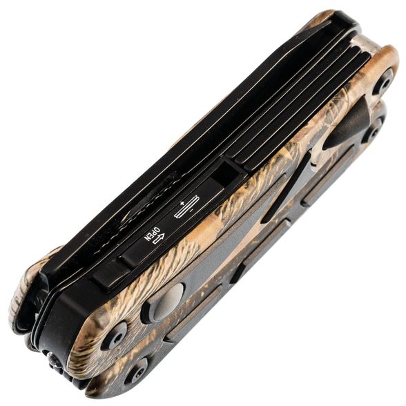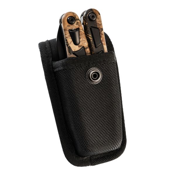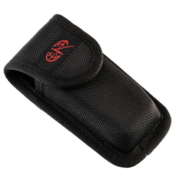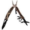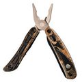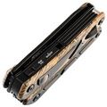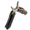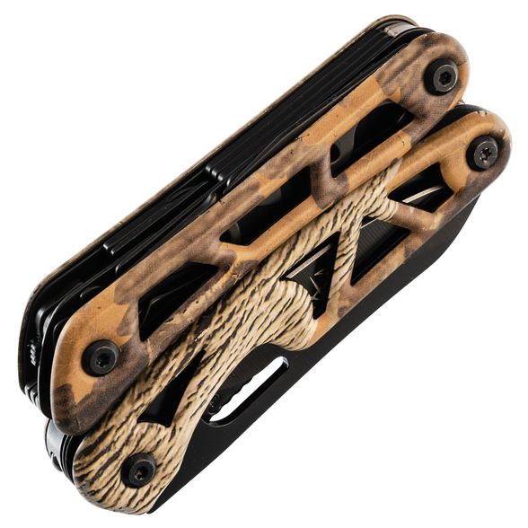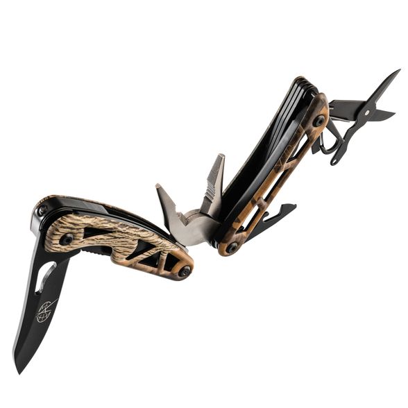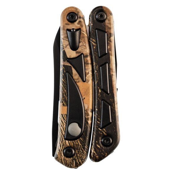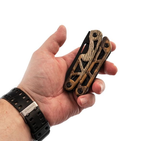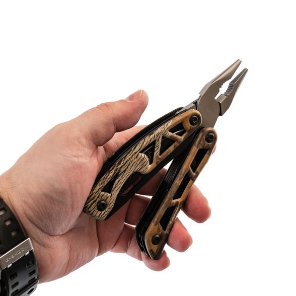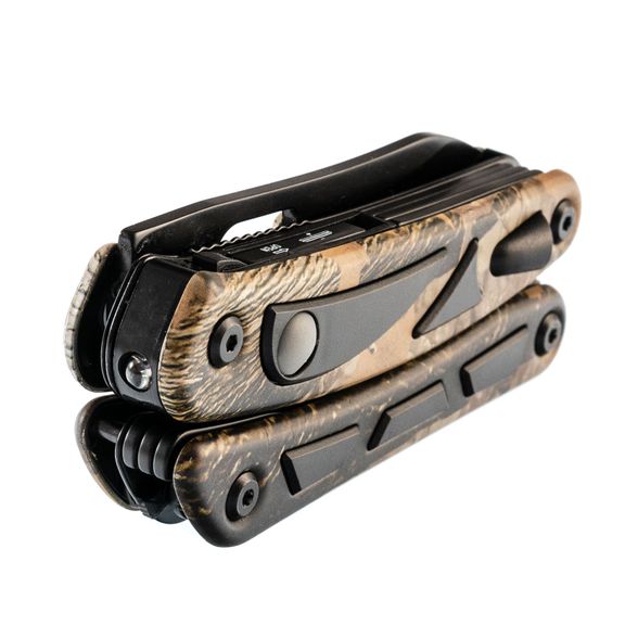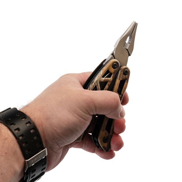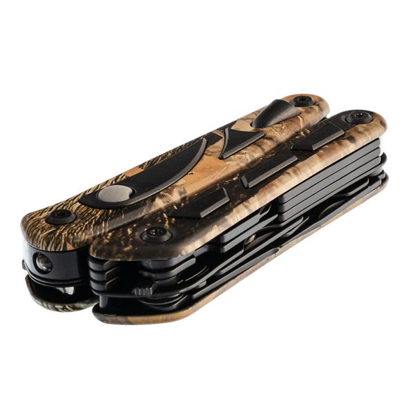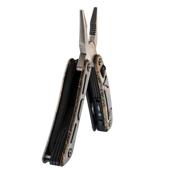 Пассатижи, нож с замком типа: Liner-lock, крестовая отвёртка, винтовая отвёртка, консервный нож, открывалка, ножницы, карабин, 2 светодиодных фонаря.
