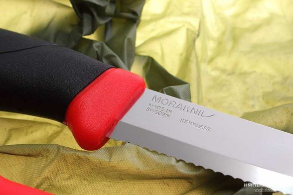 Нож Companion F Rescue используют профессиональные спасатели, любители туристических походов и экстремального спорта. Для каждого из них, этот нож предоставит максимум практичности и большую долговечность в не самых благоприятных для ножей условиях. Лезвие ножа изготовлено из шведской нержавеющей стали. Оно имеет длину 99 мм. Максимальная толщина клинка достигает 2,5 мм. Чтобы нож мог без труда справиться с любыми материалами, он получил серрейтоорную — зубчатую — заточку. Именно такой тип режущей кромки лучше всего справляется с разрезанием волокон тканей, веревок. Ближе к кончику лезвия имеется и гладкий участок, а само острие слегка закруглено. Эта особенность объясняется назначением Companion F Rescue, ведь нож используют спасатели, чтобы разрезать стропы или плотную одежду на пострадавшем человеке и не поранить его.