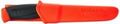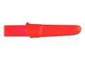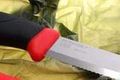 Рукоятка этого ножа изготовлена из прорезиненного материала. Ее форма позволяет удобно держать нож в руке, а резиновая поверхность не дает ножу выскользнуть из ладоней. Вместе с рукояткой, длина ножа этой модели составляет 214 мм. Основная часть рукоятки — черного цвета, а крайние элементы с обеих сторон — оранжево-красные и хорошо видны на любых природных материалах или среди других вещей. Из пластика такого же цвета сделаны ножны. Они позволяют свободно переносить нож с остальным снаряжением, а также защищают лезвие от любых негативных факторов. Помимо того, ножны имеют крепление, чтобы нож можно было повесить на пояс.