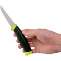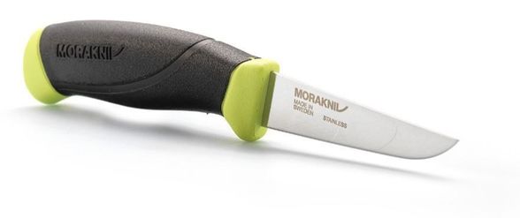 Для всех любителей рыбной ловли компания Mora предлагает отличную модель ножа под названием Fishing Comfort Fillet 090. Этот нож небольшой по размерам, прекрасно подходит для разделки рыбы по форме и сделан из материалов, которые не ржавеют при частом контакте с водой. Однако эффективно использовать его смогут не только рыбаки, но и туристы, охотники, любители пикников и любого другого вида отдыха на природе. Клинок ножика Фишин Комфорт выполнен из шведской нержавеющей стали. Это марка Sandvik 12C27, признанная одной из наиболее сбалансированных по принципу твердости, долговечности, сопротивляемости коррозии и простоты в уходе. Sandvik относится к мартенситным сталям с высоким содержанием хрома. Клинок из такого металла легко затачивается, может использоваться в условиях сырости и нуждается в минимальном ежедневном уходе. Режущая кромка ножа заточена гладко. Такую заточку не сложно подновить непосредственно на рыбалке при помощи карманной точилки. Размер лезвия ножа в длину составляет 9 см, а его толщина составляет 0,13 см.