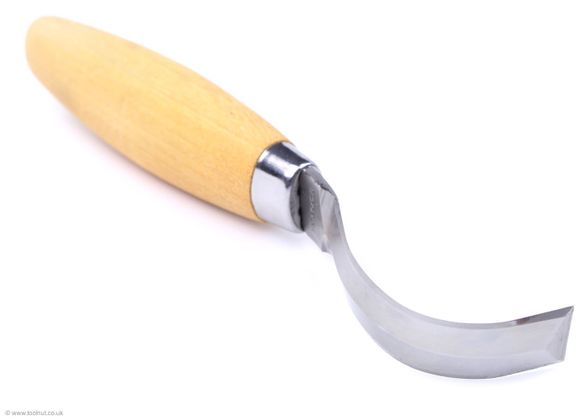 Резец-ложкорез по дереву Мора обладает острым дугообразным клинком с двусторонней заточкой, изготовленным из высокопрочной нержавеющей шведской стали марки Sandvik 12C27.