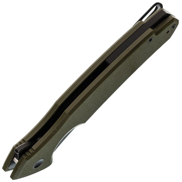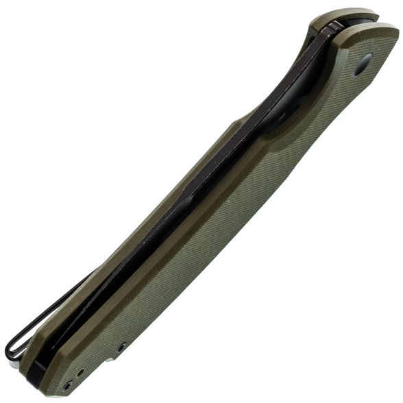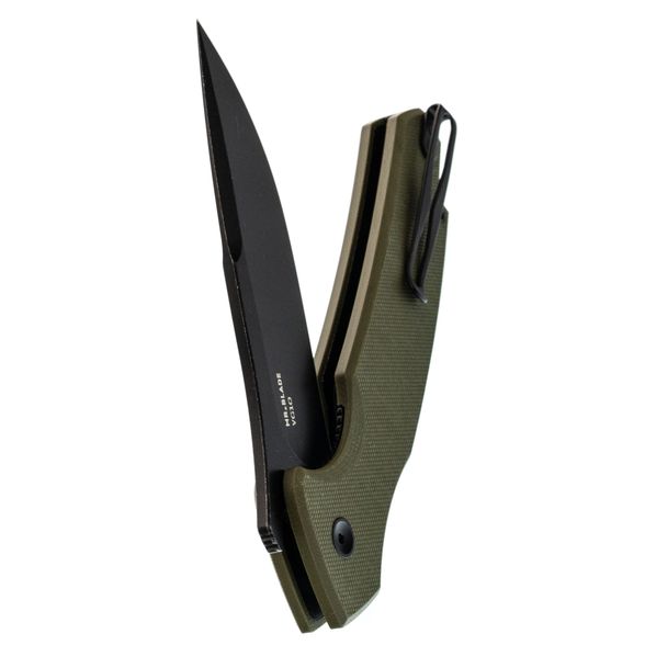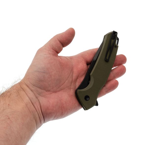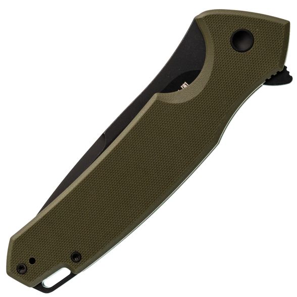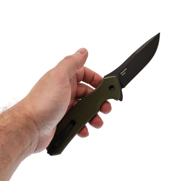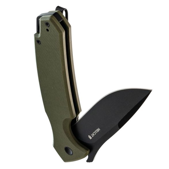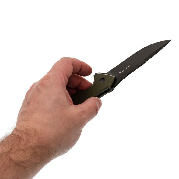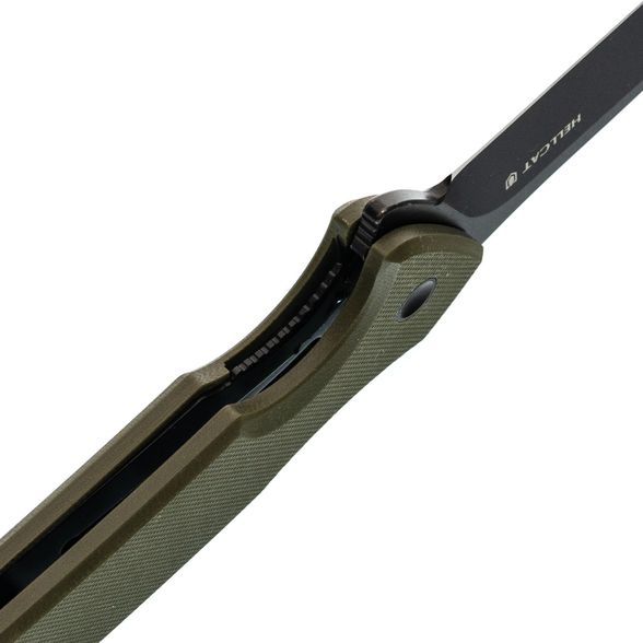 Hellcat отлично подходит для резки и строгания благодаря прямым спускам, что делает его универсальным инструментом для различных задач. Его внешний вид выполнен в стиле милитари: зелёная рукоять и чёрный клинок придают ножу брутальный и стильный вид.