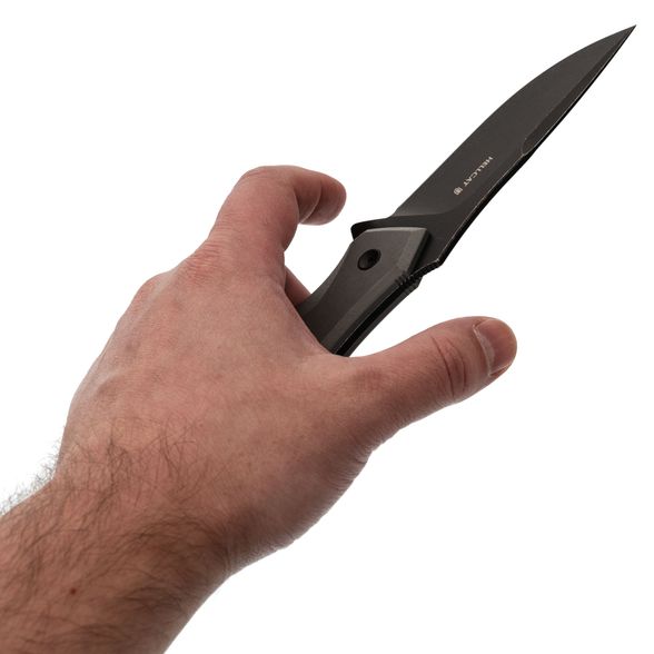 2. Рукоять: Выполнена по технологии накладного монтажа – самой прочной в индустрии, с накладками из стеклотекстолита G10. Изогнутая форма гарантирует комфорт даже при длительной эксплуатации.
